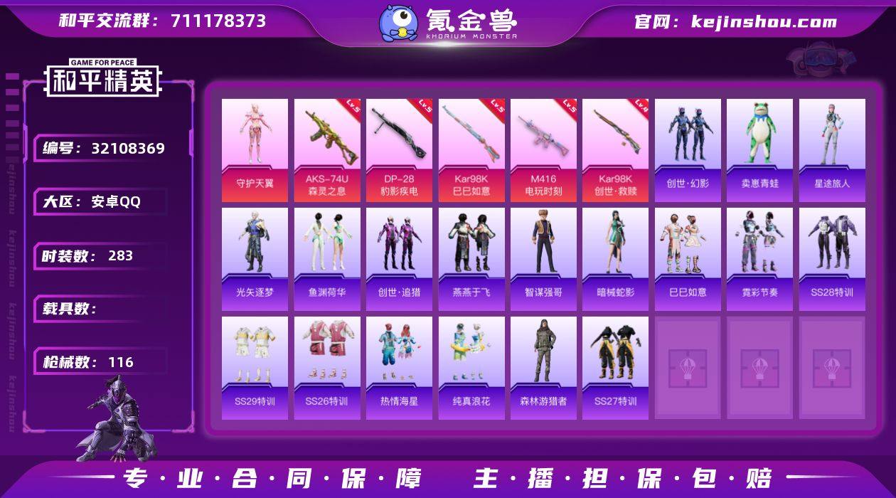 【特价出售】安卓Q-2粉装8特效枪2热门70套装116枪皮 29448热力值 1印记 历史传奇王牌10星 【2粉装】 虹云熊熊 守护天翼 【8特效枪】 M416-电玩时刻 (5级) AKS-74U-森灵之息 (5级) Kar98K-巳巳如意 (5级) DP-28-豹影疾电 (5级) Kar98K-创世救赎 (4级) AKS-74U-森灵之息 (5级) Mk14-福马献瑞 (5级) ACE32-萌骑漫游 (3级) 【2热门】 龟仙人 破蛋小黄鸡