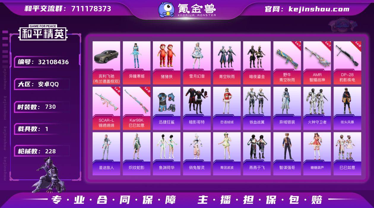 【特价出售】安卓Q-1载具5粉装5特效枪11热门188套装228枪皮 76148热力值 11印记 历史卓越王牌9星 【1载具】 宾利飞驰布罗德盖棕双色 【5粉装】 猪猪侠 雪月幻音 异瞳寒姬 青空秋雨 暗夜鎏金 【5特效枪】 SCAR-L-锦绣绵绵 (5级) Kar98K-巳巳如意 (5级) DP-28-豹影疾电 (5级) AMR-智耀战神 (7级) 野牛-青空秋雨 (7级) 【11热门】 Mark.06 迅捷狂鲨 暗影哥特 团圆交子 瑞龙福将 粉红小猪 漫步者 破蛋小黄鸡 风华少年志 极速红龙 M762-瑞龙福将 【2飞行器】 梦幻火箭飞行器 拂晓神骑飞行器 【1头盔】 梦幻火箭头盔 【2背包】 梦幻火箭背包 金羽特工背包