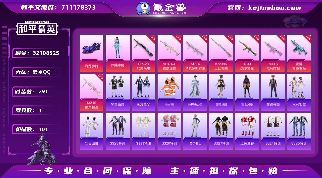 【特价出售】安卓Q-1载具1粉装8特效枪3热门78套装101枪皮 32294热力值 3印记 历史超级王牌8星 【1载具】 海龙奔腾 【1粉装】 异瞳寒姬 【8特效枪】 SCAR-L-锦绣绵绵 (5级) M416-电玩时刻 (5级) AKM-绿萝繁花 (5级) Kar98K-巳巳如意 (5级) DP-28-豹影疾电 (5级) 蜜獾-异瞳寒姬 (4级) Mk14-精灵梦叶罗丽 (5级) M249-绝对恒星 (3级) 【3热门】 小丑鱼 龟仙人 破蛋小黄鸡