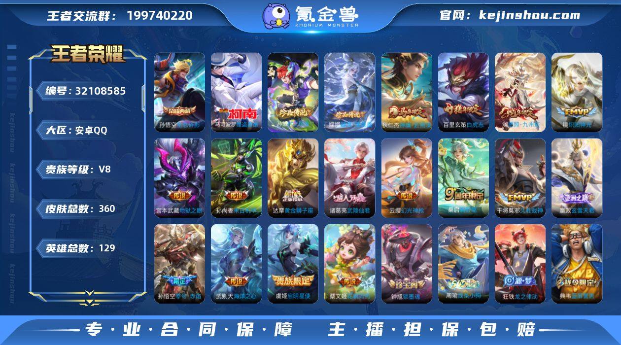 【秒换绑】安卓Q-V7-最强王者段位-107英雄-153皮肤-2典藏皮肤-2珍品传说-16传说-43史诗 【英雄全皮】:孙权全皮,敖隐全皮,澜全皮 【荣耀典藏】:孙悟空全息碎影,虞姬神鉴启示录 【珍品传说】:鲁班七号江户川柯南,马可波罗怪盗基德 【传说皮肤】:马超神骥逐星野,公孙离云诺千山,女娲愿照千秋盛,澜愿照九州拓,虞姬愿照岁时盈,云缨幻光神枪,桑启鸣野蒿,澜逐花归海,露娜霜月吟,马可波罗妄想实况,澜电玩雷克斯,诸葛亮时雨天司,干将莫邪久胜战神,后羿黄金射手座,孙尚香末日机甲,狄仁杰超时空战士 【限定皮肤】:李白谪仙醉月,狄仁杰阴阳师,赵云皇家上将,孙尚香蔷薇恋人,马可波罗暗影游猎,马可波罗山海玄木吟,马可波罗妄想实况,狄仁杰魔术师,项羽海滩派对,韩信傲雪梅枪,孙悟空至尊宝,诸葛亮时雨天司,百里玄策原初追逐者,沈梦溪龙舞盛年,鲁班七号蔬乡物语 【年限皮肤】:诸葛亮时雨天司,马可波罗山海玄木吟,女娲愿照千秋盛,澜愿照九州拓,虞姬愿照岁时盈 【赛季限定】:东皇太一噬灭天穹,太乙真人谧流熔炉,钟馗虚灵犬护,甄姬逆浪荇歌,亚瑟荣光之誓,百里玄策原初追逐者,项羽九幽镇关 【战令限定】:马可波罗暗影游猎,鲁班七号蔬乡物语,亚连破空之剑,孙悟空神迹守卫,百里守约百相守梦,老夫子百相守梦,孙膑茶境仙,马超访茗客,刘禅鸭鸭历险记,沈梦溪鸭鸭历险记,周瑜线条小狗 【史诗皮肤】:周瑜线条小狗,项羽九幽镇关,女娲万灵启世,公孙离涂山容容,黄忠百相守梦,狂铁龙之律动,刘禅鸭鸭历险记,阿轲化蝶舞,孙膑茶境仙,百里守约百相守梦,艾琳陌上桑,李白谪仙醉月,马可波罗星界特工,亚连破空之剑,鲁班七号蔬乡物语,马可波罗山海玄木吟,高渐离天秀音浪,澜赏金猎手,韩信傲雪梅枪,百里玄策原初追逐者,马可波罗暗影游猎,孙尚香时之恋人,公孙离无限星赏官...