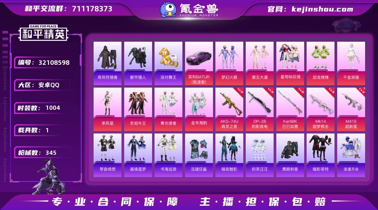 【特价出售】钱包不能注销安卓Q-6稀有1载具10粉装11特效枪22热门267套装345枪皮 104597热力值 21印记 历史传奇王牌15星 【6稀有】 奇异狩猎者 AKM-缤纷海域 都市猎人 浪漫天命 派对舞王 派对舞王(金靴子) 【1载具】 宾利BATUR(极速紫) 【10粉装】 梦幻火箭 茉莉星 虹云熊熊 千金淑猫 金丰海韵 星穹咏叹调 第五大道 炙焰牛王 恐龙拽拽 寒光使者 【11特效枪】 M416-超新星 (3级) AKS-74U-森灵之息 (5级) Kar98K-巳巳如意 (5级) DP-28-豹影疾电 (5级) Mk14-甜梦熊击 (5级) AKS-74U-森灵之息 (5级) Mk14-福马献瑞 (5级) AA12-G-萌骑幻想 (1级) PKM-萌骑夺宝 (1级) UMP45-萌骑冒险 (1级) ACE32-萌骑漫游 (1级) 【22热门】 小丑鱼 龟仙人 晶辉守护 鹰眼刺客 奶芙汪汪 迅捷狂鲨 梦起落英 怪笑疯兔 暗影哥特 团圆交子 瑞龙福将 漫步者 静谧青瓷 破蛋小黄鸡 黑色刀锋 极速红龙 AKM-奇异狩猎者 M762-奇异狩猎者 M762-瑞龙福将 M24-奇异狩猎者 S686-奇异狩猎者 M24-香水柠檬 【2飞行器】 星之彼岸飞行器 拂晓神骑飞行器 【2头盔】 梦幻火箭头盔 幻影战神头盔 【3背包】 梦幻火箭背包 幻影战神背包 深海小丑鱼背包