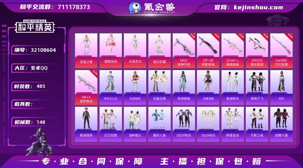 【特价出售】安卓Q-4粉装7特效枪4热门132套装148枪皮 49246热力值 6印记 历史传奇王牌14星 【4粉装】 圣堂之誓 女娲灵识 烟云彩露 樱桃泡泡 【7特效枪】 SCAR-L-锦绣绵绵 (5级) Kar98K-巳巳如意 (5级) DP-28-豹影疾电 (5级) Mk14-甜梦熊击 (5级) GROZA-镜光银凌 (5级) MG3-洛神天依 (6级) Mk14-福马献瑞 (2级) 【4热门】 Mark.06 龟仙人 破蛋小黄鸡 极速红龙