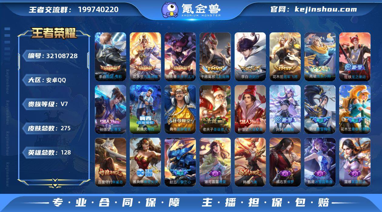 【特价出售】钱包不能注销安卓QQ/至尊星耀/275皮肤/128英雄/3典藏/0珍品无双/0无双/0珍品传说/3传说/77史诗/9稀有英雄