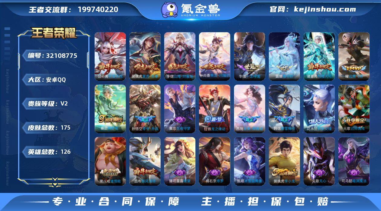 2425281 王者荣耀账号 安卓Q-V2-永恒钻石V段位-126英雄-175皮肤-10传说-55史诗 【传说皮肤】:桑启鸣野蒿,孙尚香乘龙问璇玑,露娜霜月吟,李信山海炽霜斩,裴擒虎寅虎赤拳,公孙离祈雪灵祝,诸葛亮时雨天司,孙悟空零号赤焰,曜云鹰飞将,李信一念神魔 【限定皮肤】:狄仁杰阴阳师,赵云皇家上将,孙尚香蔷薇恋人,庄周高山流水,高渐离玩趣恶龙,孙膑天狼运算者,吕布御风骁将,元歌云间偶戏,元歌无心,狄仁杰魔术师,狄仁杰万华元夜,达摩沙漠行僧,项羽海滩派对,老夫子醍醐杖,程咬金演武夺筹,韩信傲雪梅枪,兰陵王金庭之子,花木兰默契交锋,亚瑟潮玩骑士王,孙悟空零号赤焰,李元芳云中旅人,虞姬霸王别姬,钟馗驱傩正仪,雅典娜单词大作战,蔡文姬繁星吟游,鬼谷子原初探秘者,鬼谷子五谷丰年,诸葛亮时雨天司,苏烈千军破阵,公孙离祈雪灵祝,沈梦溪大漠名商,裴擒虎李小龙,裴擒虎寅虎赤拳,裴擒虎擒涛扼浪,云中君纤云弄巧,李信山海炽霜斩,猪八戒猪悟能,嫦娥拒霜思,嫦娥暖冬兔眠,西施至美乘鲤谣,蒙犽狂想玩偶喵,鲁班大师探海日志,镜匿光追影者,桑启海盐诗旅,暃星界游侠,艾琳女武神,阿古朵江河有灵,张良古海寻踪,蒙犽百解令,蒙恬荣光圣徽,鬼谷子天穹祈灯,孙尚香乘龙问璇玑,百里玄策超元猎域,刘邦剑破天穹,程咬金群星魔术团 【年限皮肤】:公孙离祈雪灵祝,诸葛亮时雨天司,吕布御风骁将,裴擒虎寅虎赤拳,李信山海炽霜斩,孙尚香乘龙问璇玑 【赛季限定】:老夫子醍醐杖,鬼谷子原初探秘者,狄仁杰万华元夜,程咬金演武夺筹,钟馗驱傩正仪,苏烈千军破阵,达摩沙漠行僧,兰陵王金庭之子,沈梦溪大漠名商,李元芳云中旅人,桑启海盐诗旅,裴擒虎擒涛扼浪,鲁班大师探海日志,张良古海寻踪,鬼谷子天穹祈灯,刘邦剑破天穹,东皇太一噬灭天穹,甄姬逆浪荇歌,蒙恬荣光圣徽 【战令限定...