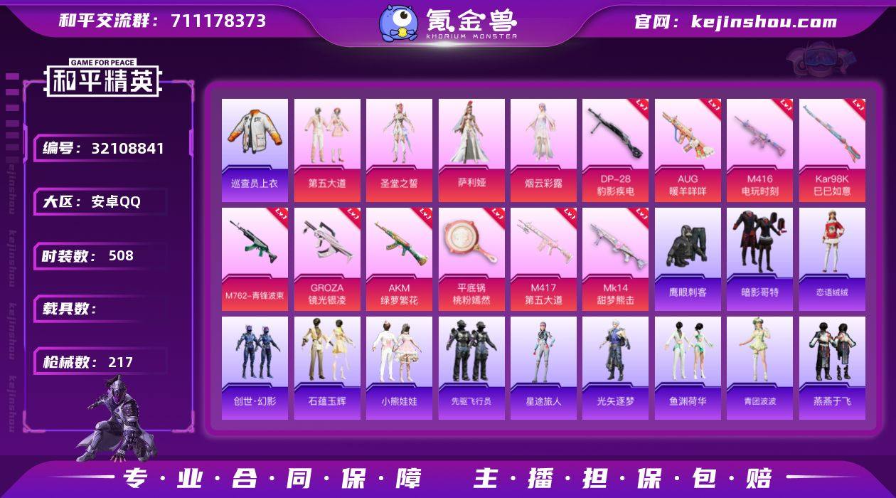 【特价出售】安卓Q-1稀有4粉装12特效枪7热门132套装217枪皮 63906热力值 14印记 历史超级王牌9星 【1稀有】 巡查衣 【4粉装】 圣堂之誓 萨利娅 烟云彩露 第五大道 【12特效枪】 M416-电玩时刻 (5级) AKM-绿萝繁花 (5级) Kar98K-巳巳如意 (1级) M762-青锋波束 (5级) DP-28-豹影疾电 (5级) AUG-暖羊咩咩 (5级) Mk14-甜梦熊击 (5级) GROZA-镜光银凌 (5级) M417-第五大道 (6级) Mk14-福马献瑞 (5级) ACE32-萌骑漫游 (2级) 平底锅-桃粉嫣然 (7级) 【7热门】 龟仙人 鹰眼刺客 暗影哥特 粉红小猪 漫步者 破蛋小黄鸡 M24-奇异狩猎者 【2飞行器】 星之彼岸飞行器 拂晓神骑飞行器