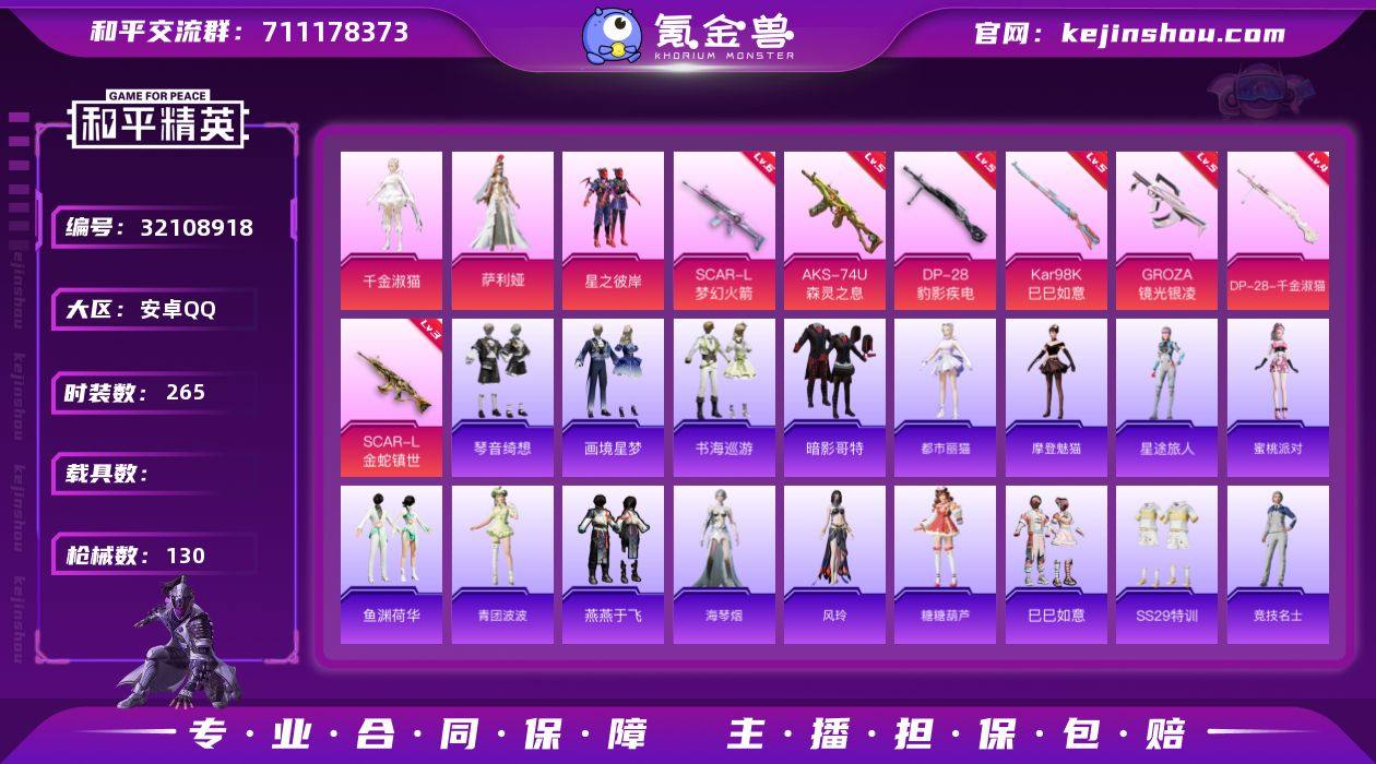 【特价出售】钱包不能注销安卓Q-3粉装12特效枪3热门66套装130枪皮 36483热力值 2印记 历史超级王牌13星 【3粉装】 萨利娅 千金淑猫 星之彼岸 【12特效枪】 SCAR-L-梦幻火箭 (6级) SCAR-L-金蛇镇世 (3级) AKS-74U-森灵之息 (5级) Kar98K-巳巳如意 (5级) DP-28-千金淑猫 (4级) DP-28-豹影疾电 (5级) GROZA-镜光银凌 (5级) AKS-74U-森灵之息 (5级) Mk14-福马献瑞 (5级) AA12-G-萌骑幻想 (2级) UMP45-萌骑冒险 (3级) ACE32-萌骑漫游 (2级) 【3热门】 暗影哥特 忍者信条 破蛋小黄鸡 【1头盔】 幻影战神头盔 【1背包】 幻影战神背包