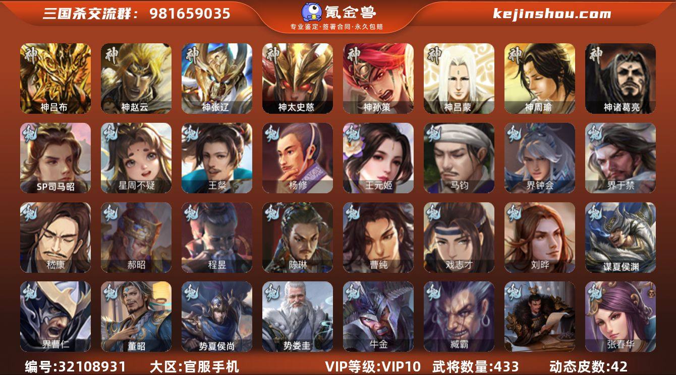 官阶:大将军;VIP等级:VIP10;史诗武将数量:65;动态皮肤数量:42;武将总数:433;史诗宝珠数量:0;将魂数量:1321;神将:6;魏国史诗武将:24;蜀国史诗武将:14;吴国史诗武将:9;群史诗武将:22