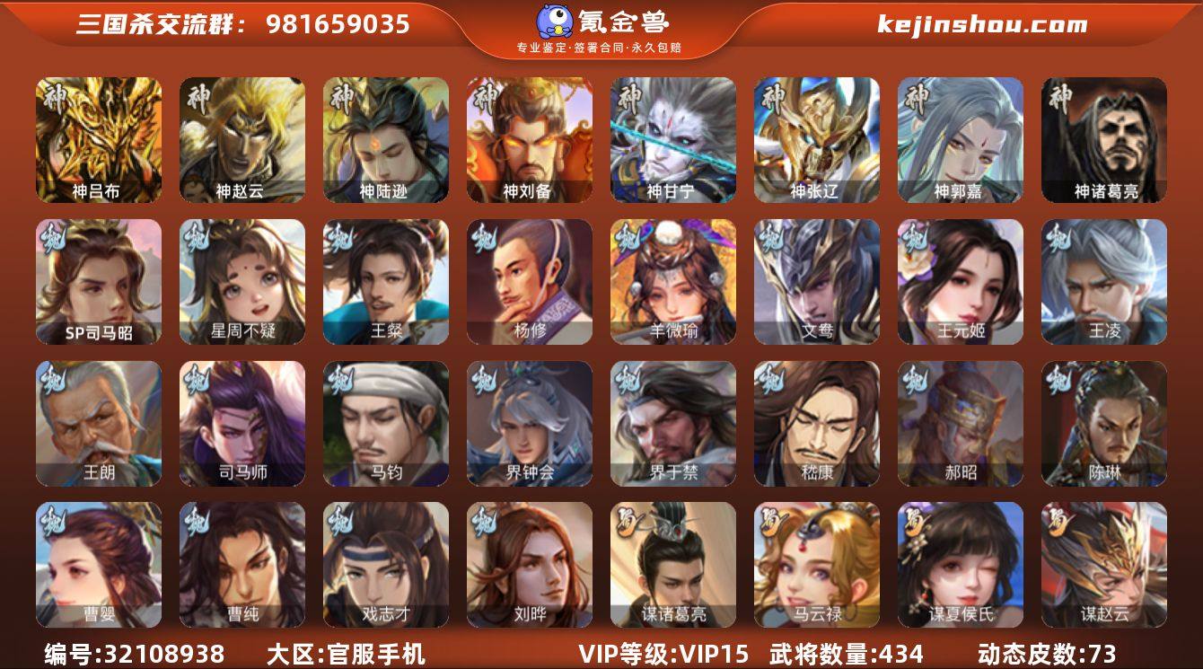 【1811】官阶:大将军;VIP等级:VIP15;史诗武将数量:76;动态皮肤数量:73;武将总数:434;史诗宝珠数量:0;将魂数量:8221;神将:11;魏国史诗武将:44;蜀国史诗武将:16;吴国史诗武将:10;群史诗武将:22 神吕布,神赵云,神陆逊,神刘备,神甘宁,神张辽,神郭嘉,神关羽,神吕蒙,神周瑜,神诸葛亮,SP司马昭,星周不疑,王粲,杨修,羊徽瑜,文鸯,王元姬,王凌,王朗,司马师,马钧,界钟会,界于禁,嵇康,郝昭,陈琳,曹婴,曹纯,戏志才,刘晔,关索,谋诸葛亮,马云騄,谋夏侯氏,谋赵云,诸葛瞻,周群,赵襄,张星彩,王平,沙摩柯,谯周,界黄忠,花鬘,董允,鲍三娘,谋黄盖,谋孙策,周处,吴景,孙皓,骆统,留赞,界朱然,界徐盛,贺齐,左慈,张让,张琪瑛,徐荣,星黄忠,王允,陶谦,苏飞,司马徽,麹义,庞德公,南华老仙,祢衡,沮授,界左慈,界李儒,公孙康,杜预,卑弥呼,张绣,李傕,许攸,神郭嘉-虎年清明(动态),神甘宁-万人辟易(动态),神陆逊-绽焰摧枯(动态),神吕蒙-兼资文武(动态),神诸葛亮-孟章诛邪(动态),神曹操-天下归心,神曹操-玄天通冥(动态),神吕布-监兵噬魅(动态),神赵云-战龙在野(动态),SP司马昭-鼠年冬至(动态),曹丕-气荡山河(动态),SP蔡文姬-兔年冬日(动态),许褚-兔年端午(动态),司马懿-鹰视狼顾(动态),郭嘉-十胜十败(动态),张郃-背水一战(动态),王基-独秉固志(动态),界司马懿-鹰视狼顾(动态),界郭嘉-十胜十败(动态),王异-轻燕掠影(动态),钟会-谋谟之勋(动态),曹真-虎年春节(动态),钟繇-稳定关右(动态),界王异-轻燕掠影(动态),界钟会-谋谟之勋(动态),戏志才-举棋若定(动态),曹婴-兔年春节(动态),曹婴-锋芒毕露(动态),曹纯-长坂败备(动态),王元姬-鼠年冬至(动态),羊徽瑜-牛年中秋(动态),刘备-猪年圣诞(动态),刘备-龙骧麟振(动态),关羽-明良千古(动态),马超-牛年春节(动态),马超-西凉雄狮(动态),马超-虎年冬至(动态),张飞-猪年中秋(动态),赵云-截江救主(动态...