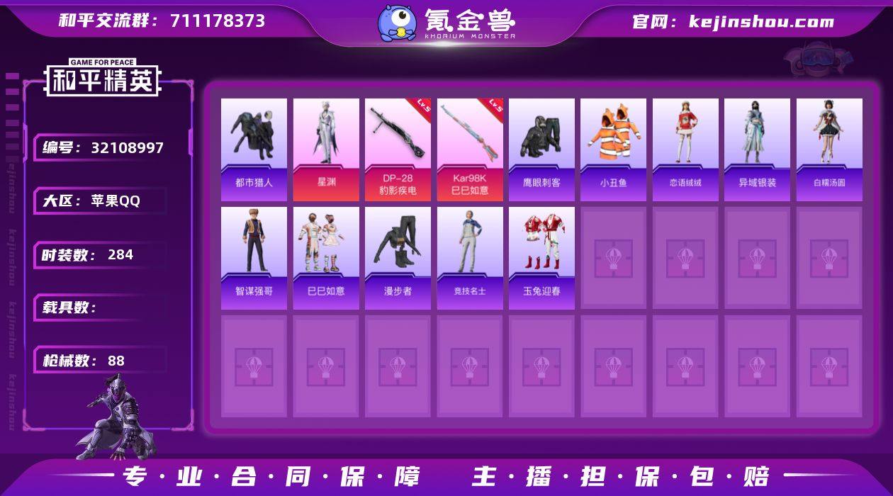 【特价出售】苹果Q-1稀有1粉装5特效枪4热门70套装88枪皮 23042热力值 8印记 历史超级王牌9星 【1稀有】 都市猎人 【1粉装】 星渊 【5特效枪】 Kar98K-巳巳如意 (5级) DP-28-豹影疾电 (5级) 信号枪-金乌曜日 (5级) Mk14-福马献瑞 (5级) ACE32-萌骑漫游 (5级) 【4热门】 小丑鱼 鹰眼刺客 漫步者 破蛋小黄鸡
