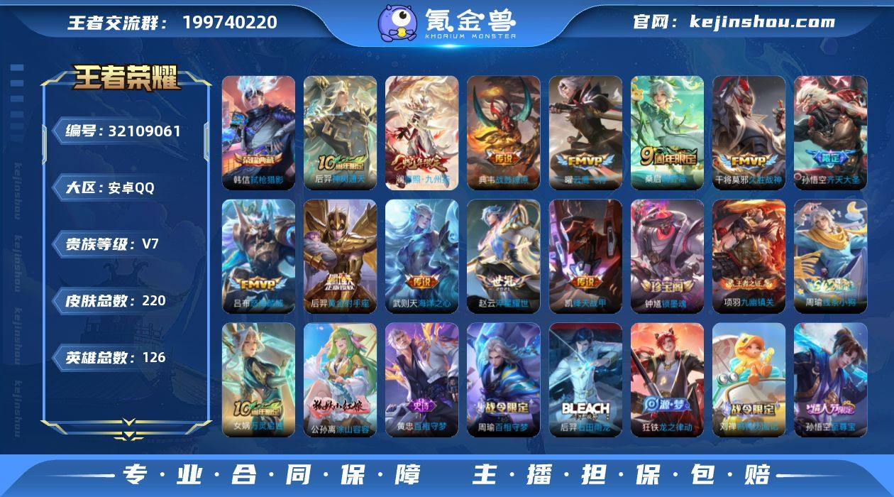 安卓Q-V7-永恒钻石I段位-126英雄-220皮肤-1典藏皮肤-12传说-52史诗 【英雄全皮】:孙权全皮 【荣耀典藏】:韩信弑枪猎影 【传说皮肤】:后羿神树通天,澜愿照九州拓,桑启鸣野蒿,典韦战鼓燎原,孙悟空齐天大圣,吕布怒海麟威,赵云淬星耀世,铠绛天战甲,曜云鹰飞将,干将莫邪久胜战神,后羿黄金射手座,武则天海洋之心 【限定皮肤】:蒙犽顽岩魄,姜子牙天穹之誓,狄仁杰阴阳师,赵云皇家上将,孙尚香蔷薇恋人,庄周高山流水,元歌云间偶戏,元歌无心,狄仁杰魔术师,达摩沙漠行僧,项羽海滩派对,韩信傲雪梅枪,兰陵王金庭之子,孙悟空至尊宝,孙悟空孙行者,孙悟空齐天大圣,李元芳云中旅人,钟馗驱傩正仪,鬼谷子五谷丰年,苏烈千军破阵,沈梦溪大漠名商,裴擒虎擒涛扼浪,嫦娥暖冬兔眠,蒙犽狂想玩偶喵,鲁班大师探海日志,桑启海盐诗旅,阿古朵江河有灵,张良古海寻踪,鬼谷子天穹祈灯,沈梦溪龙舞盛年,鲁班七号蔬乡物语,李元芳蔬乡物语,刘邦剑破天穹,周瑜熔金海岸 【年限皮肤】:澜愿照九州拓 【赛季限定】:钟馗驱傩正仪,苏烈千军破阵,达摩沙漠行僧,兰陵王金庭之子,沈梦溪大漠名商,李元芳云中旅人,桑启海盐诗旅,裴擒虎擒涛扼浪,鲁班大师探海日志,张良古海寻踪,鬼谷子天穹祈灯,刘邦剑破天穹,姜子牙天穹之誓,东皇太一噬灭天穹,太乙真人谧流熔炉,钟馗虚灵犬护,甄姬逆浪荇歌,亚瑟荣光之誓,项羽九幽镇关 【战令限定】:蒙犽狂想玩偶喵,元歌云间偶戏,嫦娥暖冬兔眠,鲁班七号蔬乡物语,李元芳蔬乡物语,孙膑茶境仙,马超访茗客,刘禅鸭鸭历险记,沈梦溪鸭鸭历险记,周瑜百相守梦,孙策百相守梦,周瑜线条小狗 【史诗皮肤】:钟馗锁墨魂,周瑜线条小狗,项羽九幽镇关,女娲万灵启世,公孙离涂山容容,黄忠百相守梦,周瑜百相守梦,后羿石田雨龙,狂铁龙之律动,刘禅鸭鸭历险记,阿轲化蝶...