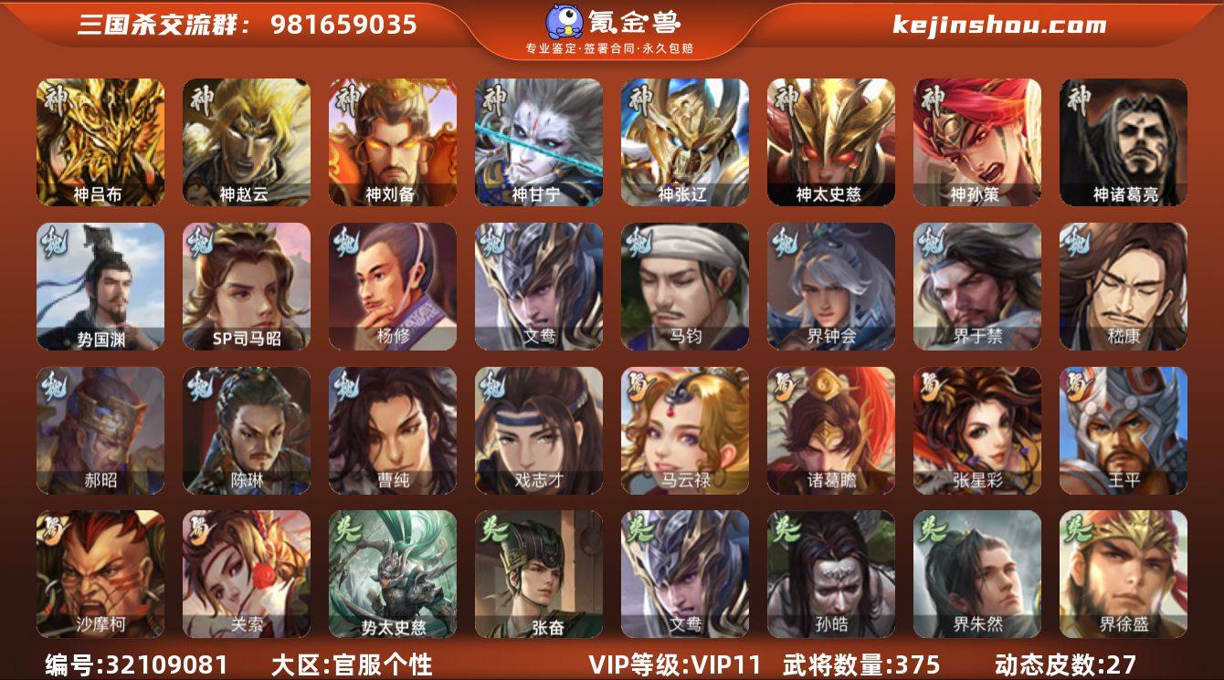 【1830】官阶:大将军;VIP等级:VIP11;史诗武将数量:48;动态皮肤数量:27;武将总数:375;史诗宝珠数量:0;将魂数量:3815;神将:11;魏国史诗武将:29;蜀国史诗武将:6;吴国史诗武将:6;群史诗武将:15 神吕布,神赵云,神刘备,神甘宁,神张辽,神太史慈,神孙策,神关羽,神吕蒙,神周瑜,神诸葛亮,SP司马昭,杨修,文鸯,魏-司马昭,马钧,界钟会,界于禁,嵇康,郝昭,陈琳,曹纯,戏志才,势国渊,关索,马云騄,诸葛瞻,张星彩,王平,沙摩柯,张奋,孙皓,界朱然,界徐盛,贺齐,势太史慈,左慈,张让,星黄忠,陶谦,司马徽,审配,麹义,祢衡,沮授,界左慈,公孙康,杜预,张绣,李傕,许攸,神孙策-霸王再世(动态),神诸葛亮-孟章诛邪(动态),神曹操-玄天通冥(动态),神赵云-战龙在野(动态),SP司马昭-鼠年冬至(动态),曹植-龙年中秋(动态),司马懿-鹰视狼顾(动态),邓艾-神兵天降(动态),王基-独秉固志(动态),界司马懿-鹰视狼顾(动态),界邓艾-神兵天降(动态),张春华-宣穆夜袭(动态),王异-轻燕掠影(动态),界王异-轻燕掠影(动态),辛宪英-鼠年春节(动态),朱灵-以战破氐(动态),司马昭-昭威淮南(动态),张辽-龙生九子(动态),星徐晃-斧引霹雳(动态),刘备-猪年圣诞(动态),马超-牛年春节(动态),黄月英-鼠年春节(动态),黄月英-木牛流马(动态),界刘备-猪年圣诞(动态),界马超-牛年春节(动态),界黄月英-鼠年春节(动态),界黄月英-木牛流马(动态),马云騄-牛年春节(动态),赵襄-猪年春节(动态),关索-鼠年中秋(动态),马良-荡然由心(动态),孙权-猪年端午(动态),陆逊-猪年圣诞(动态),周瑜-鼠年春节(动态),界周瑜-鼠年春节(动态),界陆逊-猪年圣诞(动态),界孙权-猪年端午(动态),孙鲁育-猪年春节(动态),曹节-猪年大雪(动态),SP貂蝉-驭魂千机(动态),SP赵云-单骑救主(动态),苏飞-肝胆相照(动态),兀突骨-鼠年春节(动态),祢衡-击鼓骂曹(动态)