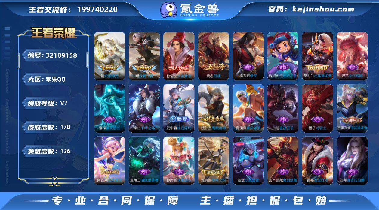 126英雄 178皮肤 可修改实名 男号 【英雄全皮】猪八戒全皮 【稀有英雄】大司命,嬴政(始皇帝),韩信(韩跳跳),夏洛特(夏师傅),艾琳,橘右京(橘子),娜可露露(鸟人),不知火舞,赵云,金蝉(唐僧),戈娅 【荣耀水晶】颠倒童话·魔镜 【传说皮】云鹰飞将(小将军),炽阳神光 【珍宝阁皮】万物之道,蔷薇恋人 【赛季/战令皮】古海寻踪(s33),海盐诗旅(s30),擒涛扼浪(s31),探海日志(s32),炼金王(s6),凯尔特女王(s7),狰(s8),饕餮(s9),烛龙(s10),重明(s11),穷奇(s12),御狮(s13),御霄(s14),御旌(s15),御銮(s16),混沌棋(s18),疑决卦(s19),醍醐杖(s20),原初探秘者(s21),万华元夜(s22),演武夺筹(s23),驱傩正仪(s24),千军破阵(s25),猎兽之王,白昼王子,神迹守卫-钟馗,狮舞东方,星空之诺,银河之约,夺宝奇兵,迷踪丽影,西部大镖客-猪八戒,暗影游猎(游乐娃子),沙漠行僧(s26),金庭之子(s27),大漠名商(s28),云中旅人(s29) 【史诗皮】线条小狗-周瑜,百相守梦-黄忠,电玩小子(小书包),千年之狐,江河有灵,偶像歌手,龙骑士(小龙虾),猫狗日记-孙策,乱世虎臣,修罗,女仆咖啡,水果甜心,天才门将,星夜王子,功夫厨神,德古拉伯爵,暗隐猎兽者,幽灵船长,鬼剑武藏,心灵战警,舞动绿茵,纤云弄巧,乘风破浪,逐浪之夏,水晶猎龙者,金属风暴,原初追逐者,圣诞狂欢,圣诞恋歌,鹰眼统帅,暗夜贵公子,黎明之约 【限定皮】遇见飞天,高山流水,五谷丰年,梁祝,烈魂,祈雪灵祝(雪兔子),李小龙,霸王别姬-虞姬,默契交锋-花木兰,猪悟能,大圣娶亲,时之奇旅-妲己 【普通皮】星梦巡礼,功夫炙烤,街头霸王,朵莉亚金色潮汐,龙舞盛年,熔金海岸,荣光之誓,鹤鸣心笺,罗小黑战记-哪吒,云械蓝图,妄想特派,万事如意,五福同心,龙腾万里,花好人间,归虚梦演-孙膑,海滩丽影,海滩派对,皇家上将,魔术师,沉稳之力,掌控之力,守护之力,坚韧之力,敏锐之力,霸王丸,化身
