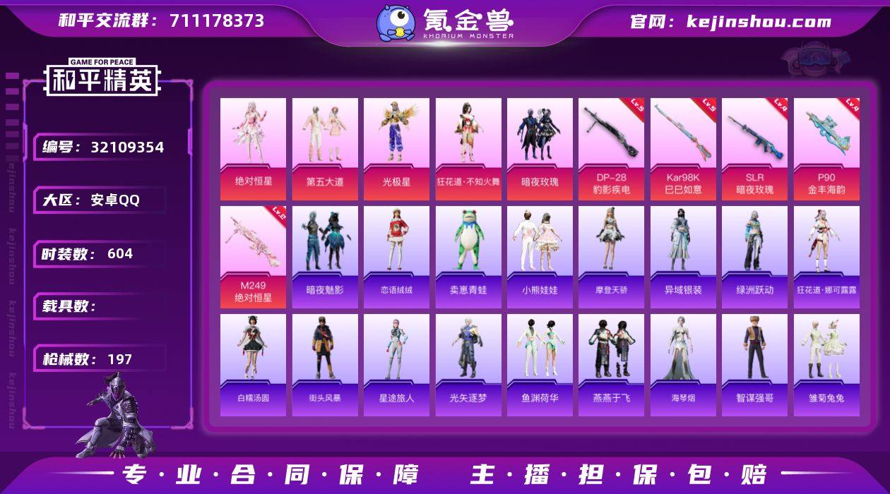 【特价出售】安卓Q-5粉装6特效枪8热门162套装197枪皮 60181热力值 14印记 历史传奇王牌17星 【5粉装】 狂花道·不知火舞 光极星 绝对恒星 第五大道 暗夜玫瑰 【6特效枪】 P90-金丰海韵 (4级) Kar98K-巳巳如意 (5级) DP-28-豹影疾电 (5级) M249-绝对恒星 (2级) SLR-暗夜玫瑰 (4级) Mk14-福马献瑞 (4级) 【8热门】 Mark.06 龟仙人 团圆交子 瑞龙福将 粉红小猪 破蛋小黄鸡 极速红龙 M762-瑞龙福将 【1飞行器】 天之羽翼飞行器 【1背包】 甜蜜誓约背包