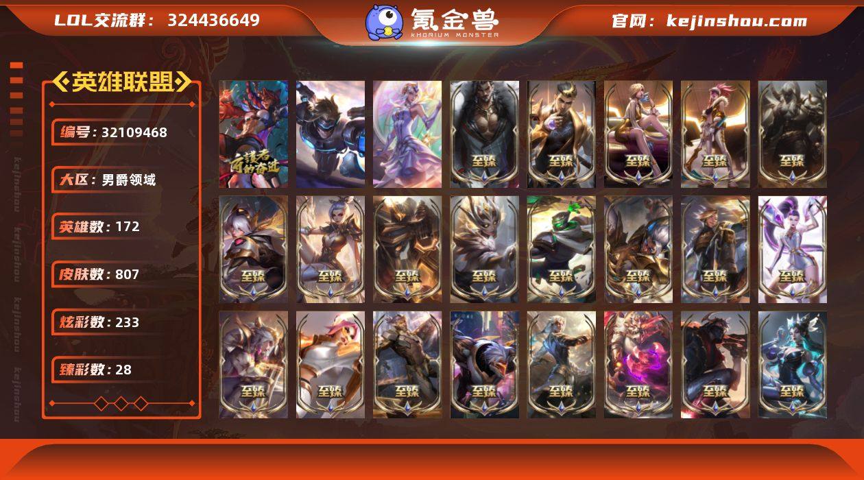 【Hyx224】男爵领域-未定级【172英雄-807皮肤-233炫彩-3终极-47神话-159限定-101传说-142史诗】 可二次 优质皮肤:大元素使拉克丝,斗魂觉醒莎弥拉,未来战士伊泽瑞尔 【神话皮肤】:殿堂传奇乐芙兰,十五周年纪念希维尔,暗星科加斯,神凰行者瑞羽圣凰艾尼维亚,星之守护者塔莉垭,永恒之森奥恩,灰烬杀手塞拉斯,灰烬骑士派克,海克斯科技吉格斯,海克斯科技克格莫,海克斯科技玛尔扎哈,海克斯科技魔腾,恐惧新星德莱厄斯,摄魂使者薇恩,至臻征服者贾克斯,至臻天龙之子伊泽瑞尔,至臻北极星钢影卡蜜尔,至臻北极星使者沃里克,至臻DRX亚托克斯,至臻福牛守护者菲奥娜,至臻海珀利安小队X09星环灵风迦娜,至臻黑夜使者凯隐,至臻花仙使者卡特琳娜,至臻剪纸仙灵希维尔,至臻绝息圣堂厄运小姐,至臻KDA阿卡丽,至臻KDAALLOUT卡莎,至臻KDA伊芙琳,至臻灵魂莲华易,至臻灵能特工伊泽瑞尔,至臻魔女阿卡丽,至臻魔女婕拉,至臻墨之影武者亚索,至臻女帝黛安娜,至臻神龙尊者均衡之龙沃利贝尔,至臻神龙尊者炎龙瑟提,至臻王国机神玄武盖伦,至臻西部魔影猎天使恶魔泰隆,至臻腥红之月亚托克斯,至臻星之守护者索拉卡,至臻星之守护者辛德拉,至臻源计划逆流塞拉斯,至臻源计划阴劫,至臻源计划正义艾瑞莉娅,至臻玉剑传说武剑仙 【热门头像】:春晖神女头像 【至臻皮肤】:至臻灵魂莲华易,至臻剪纸仙灵希维尔,至臻星之守护者索拉卡,至臻北极星使者沃里克,至臻绝息圣堂厄运小姐,至臻征服者贾克斯,至臻KDA伊芙琳,至臻源计划正义艾瑞莉娅,至臻海珀利安小队X09星环灵风迦娜,至臻狼神英灵斯维因,至臻花仙使者卡特琳娜,至臻灵能特工伊泽瑞尔,至臻天龙之子伊泽瑞尔,至臻KDA阿卡丽,至臻魔女阿卡丽,至臻王国机神玄武盖伦,至臻西部魔影猎天使恶魔泰隆,至臻玉剑传说武剑仙锐雯,至臻神龙尊者均衡之龙沃利...