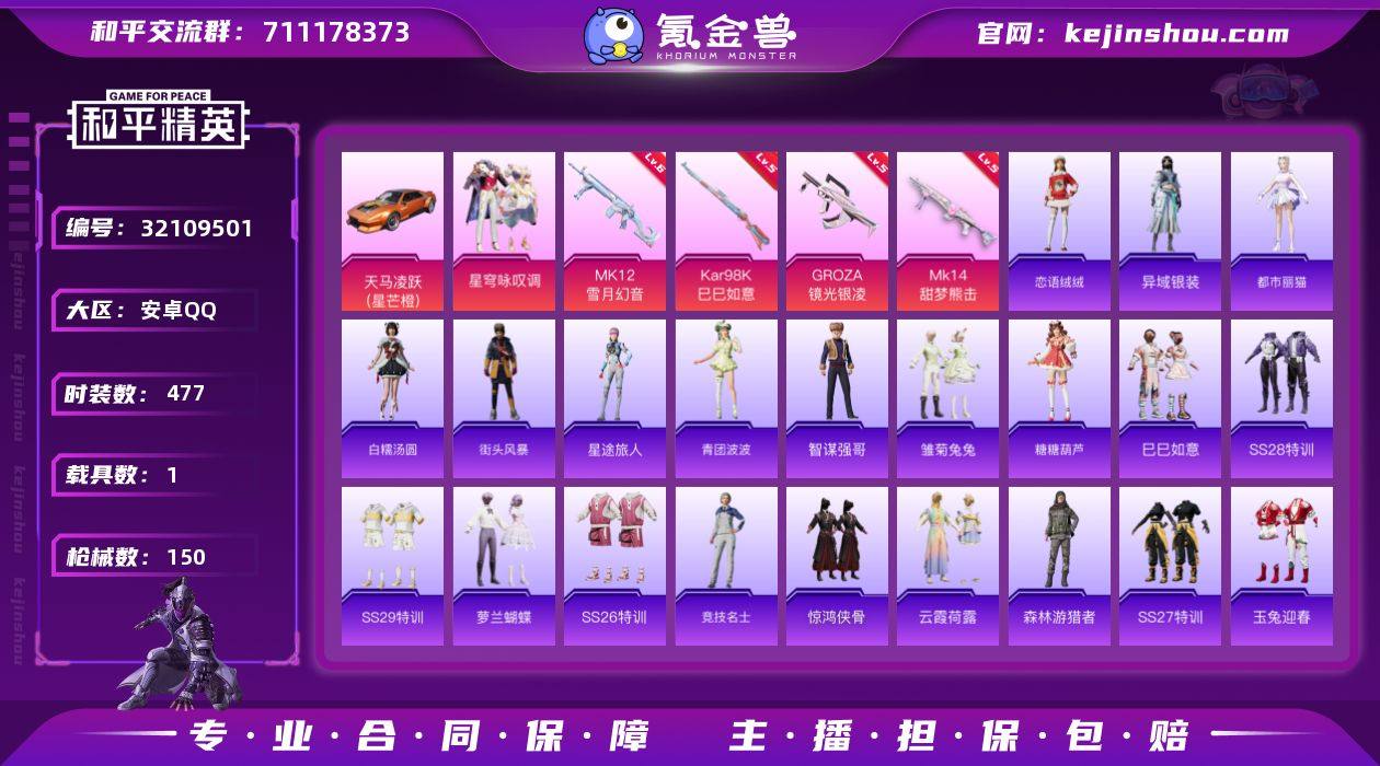 【特价出售】安卓Q-1载具1粉装5特效枪2热门118套装150枪皮 41525热力值 12印记 历史卓越王牌4星 【1载具】 天马凌跃(星芒橙) 【1粉装】 星穹咏叹调 【5特效枪】 Kar98K-巳巳如意 (5级) Mk14-甜梦熊击 (5级) MK12-雪月幻音 (6级) GROZA-镜光银凌 (5级) ACE32-萌骑漫游 (5级) 【2热门】 龟仙人 破蛋小黄鸡