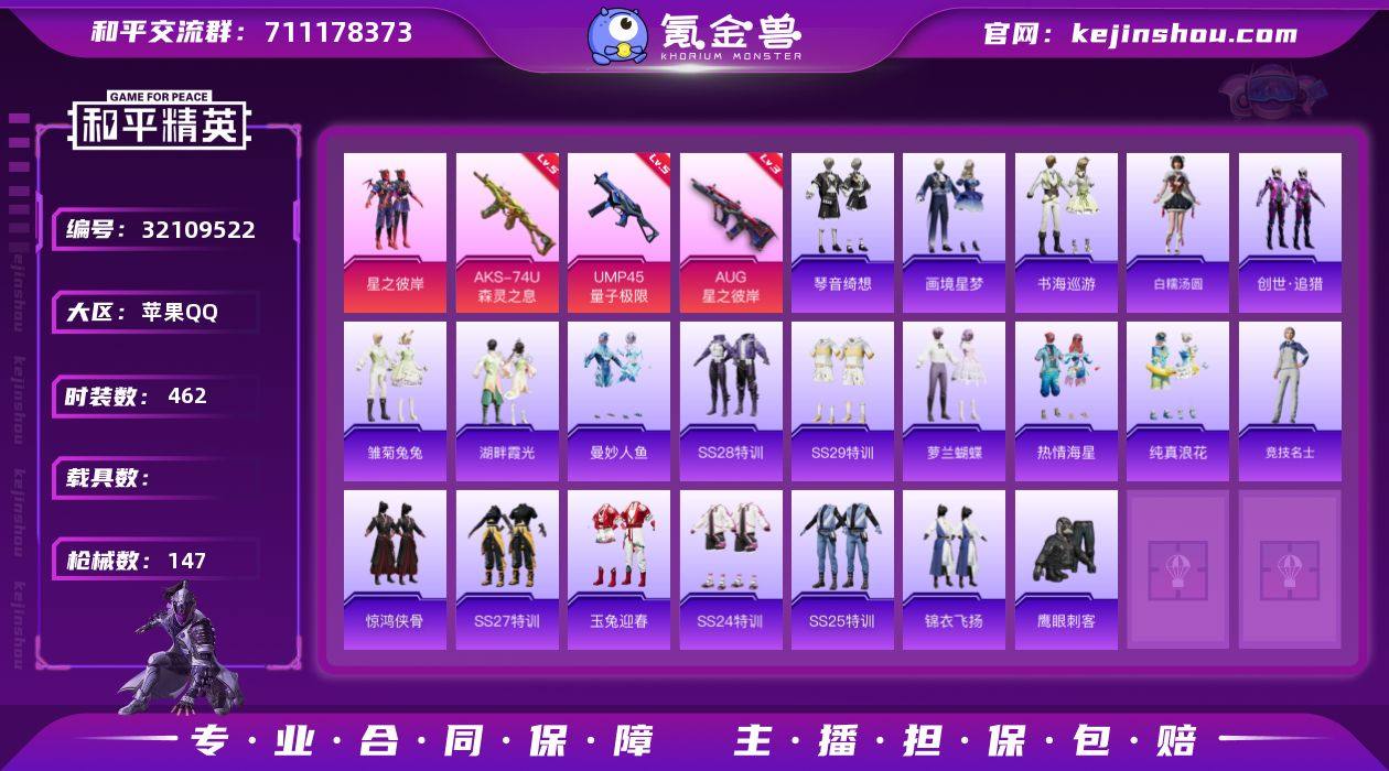 【特价出售】苹果Q-2粉装6特效枪6热门114套装147枪皮 40809热力值 4印记 历史传奇王牌15星 【2粉装】 虎痴许褚 星之彼岸 【6特效枪】 AKS-74U-森灵之息 (5级) UMP45-量子极限 (5级) AUG-星之彼岸 (3级) AKS-74U-森灵之息 (5级) Mk14-福马献瑞 (5级) AA12-G-萌骑幻想 (2级) 【6热门】 Mark.06 鹰眼刺客 TianBa战队服 破蛋小黄鸡 极速红龙 M762-奇异狩猎者 【1飞行器】 星之彼岸飞行器 【1背包】 深海小丑鱼背包