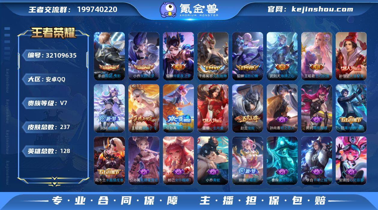 128英雄 237皮肤 典藏英雄武则天 可修改实名 女号 【英雄全皮】大禹全皮 【稀有英雄】大司命,嬴政(始皇帝),韩信(韩跳跳),夏洛特(夏师傅),艾琳,橘右京(橘子),娜可露露(鸟人),不知火舞,赵云,金蝉(唐僧),戈娅 【荣耀水晶】鸣剑·曳影,天鹅之梦(小乔典藏) 【传说皮】神树通天,仲夏夜之梦(大飞蛾),海洋之心,久胜战神,猫影幻舞,乞巧织情 【珍宝阁皮】胡桃夹子,蔷薇恋人,玩趣恶龙 【赛季/战令皮】古海寻踪(s33),海盐诗旅(s30),擒涛扼浪(s31),探海日志(s32),顽趣-梦奇,剑破天穹(s35),天穹祈灯(s34),天穹之誓(s36),饕餮(s9),烛龙(s10),重明(s11),穷奇(s12),御狮(s13),御霄(s14),御旌(s15),御銮(s16),朔风刀(s17),混沌棋(s18),疑决卦(s19),醍醐杖(s20),原初探秘者(s21),万华元夜(s22),演武夺筹(s23),驱傩正仪(s24),千军破阵(s25),西部大镖客-猪八戒,暗影游猎(游乐娃子),沙漠行僧(s26),金庭之子(s27),电玩高手(电玩铁子),午后时光,大漠名商(s28),云中旅人(s29) 【史诗皮】化蝶舞,线条小狗-周瑜,九幽镇关,涂山容容,遇见神鹿,紫霞仙子,特工魅影,千年之狐,江河有灵,蒙恬荣光圣徽,真我赫兹(百里守约),无限星赏官,冰冠公主,青蛇,偶像歌手,暗夜猫娘,末日机甲-吕布,猫狗日记-孙策,猫狗日记-大乔,时之恋人-孙尚香,节奏热浪,女仆咖啡,摇滚巨星,水果甜心,天才门将,星夜王子,心灵骇客,功夫厨神,暗隐猎兽者,幽灵船长,鬼剑武藏,诗语江南,纤云弄巧,繁星吟游(呼啦呼啦),拒霜思,缤纷独角兽,逐浪之夏,水晶猎龙者,曙光守护者,唤灵魅影,箭羽风息,金属风暴,原初追逐者,圣诞狂欢,圣诞恋歌,鹰眼统帅,魅力维加斯,黎明之约,无心,未来纪元-赵云 【限定皮】鸣野蒿,凤凰于飞,星穹之声,遇见飞天,高山流水,五谷丰年,游园惊梦,梁祝,龙胆,李小龙,朱雀志(守约年限),霸王别姬-虞姬,默契交锋-兰陵王,孙行者,