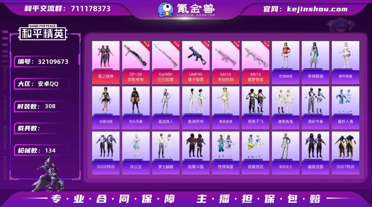 安卓 手Q-9粉装-1特效枪-0载具-35160热力值-4印记-102套装-107枪皮 【热门品类】:套装-龟仙人,套装-粉红小猪 【粉色套装】:粉装-蝶舞迷情,粉装-冰霜白皇,粉装-炙焰红王,角色-洛天依,粉装-圣光天使,粉装-荒漠赏金,粉装-霞光圣骑,粉装-暗夜鎏金,角色-星云暗核 【粉色枪皮等级】:DP-28-暗夜鎏金(七级DP-28-暗夜鎏金) 【粉色枪皮】:DP-28-暗夜鎏金 【粉色飞行器】:春暖花开飞行器 【粉色降落伞】:春暖花开降落伞,星之彼岸降落伞,洛神天依降落伞,恐龙拽拽降落伞,荒漠赏金降落伞,垂柳戏鸭降落伞,暗夜鎏金降落伞,异瞳寒姬降落伞,炫彩糖果降落伞 【稀有套装】:套装-龟仙人,套装-炫彩糖果 【稀有枪皮】:AKM-春暖花开,AKM-环太平洋,AKM-破晓战魂,M16A4-幻世战舞者,M16A4-甜心亚梦,M16A4-生命誓言,SCAR-L-玉兔迎春,M416-糯团青竹,M416-蓝色火焰,GROZA-异彩先驱,GROZA-恐龙拽拽,GROZA-春暖花开,GROZA-田园牧歌,AUG-耀粉歌者,QBZ-彩虹符号,QBZ-洛神天依,QBZ-飞驰魅影,M762-天降萌叽,M762-暗夜鎏金,M762-绯红前夜,Mk47-洛神天依,AC-VAL-天降萌叽,AC-VAL-甜心亚梦,蜜獾-垂柳戏鸭,蜜獾-娇憨猪猪,UZI-娇憨猪猪,UZI-红色方程式,UMP45-夜灯,UMP45-春暖花开,Vector-田园牧歌,汤姆逊-天降萌叽,汤姆逊-异彩先驱,汤姆逊-暗夜鎏金,汤姆逊-耀粉歌者,MP5K-异彩先驱,P90-飞驰魅影,Kar98K-彩虹符号,Kar98K-洛神天依,Kar98K-炫彩节奏,Kar98K-红色方程式,Kar98K-飞驰魅影,M24-未来战士,M24-炫彩节奏,M24-冰封烈焰,AWM-恐龙拽拽,SKS-迅猛狂鲨,VSS-田园牧歌,VSS-繁花小夜曲,Mini14-异彩先驱,Mini14-春暖花开,Mini14-炫彩节奏,Mini14-穿刺龙虾,Mini14-耀粉歌者,SLR-娇憨猪猪,SLR-彩虹符号,S686-冰封烈焰,S686-未来战士,S686-生命誓言,S1897-春暖花开,S1897-...