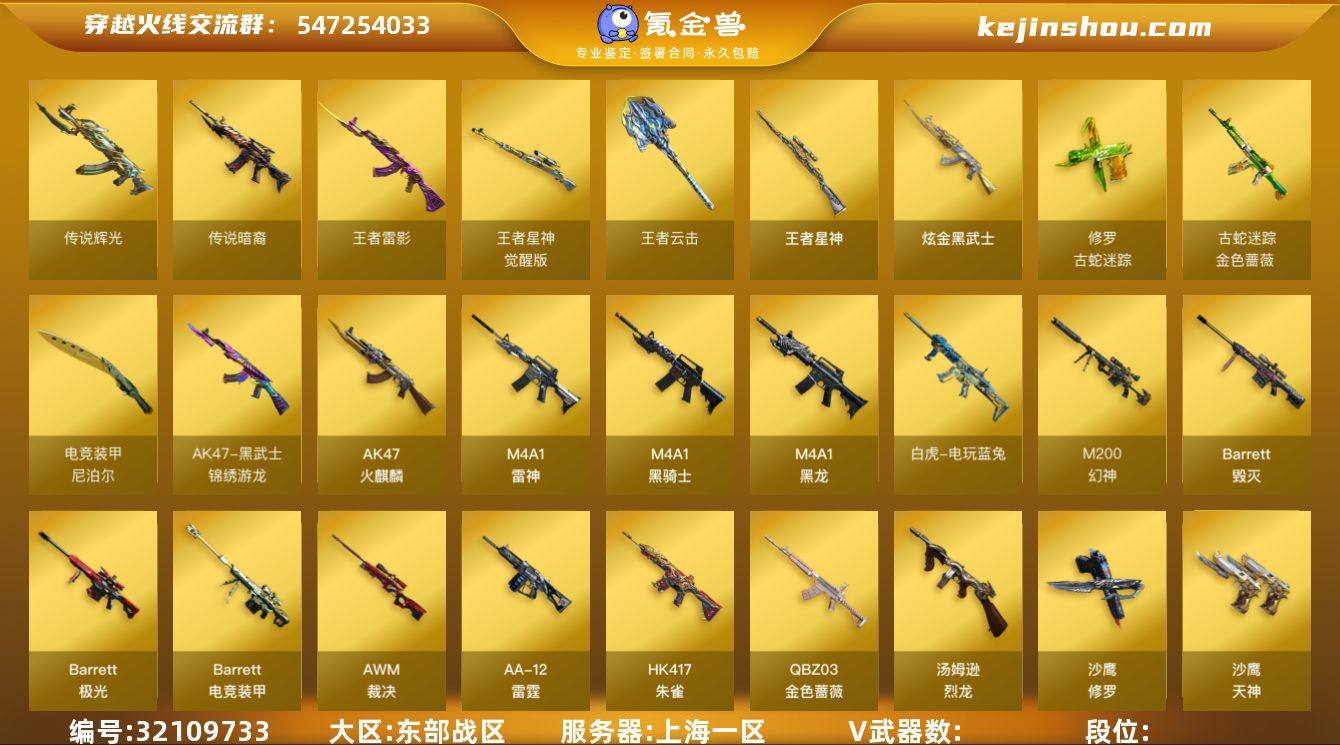 【自带包赔 最高三倍】:西部战区:陕西一区-LV94-上将1-传奇2-106V-6王者-4炫金 【传说武器】:传说幽瞳,传说幽冥 【热门武器】:炽芒蝶刃,G36C-幻影,加特林-炼狱,Kar98K-星神,M200-幻神*2,M200-竞技荣光,M4A1-黑骑士,QBZ03-金色蔷薇*4,RPK-盘龙,Scar Light-白虎,沙鹰-修罗*3,USP-雷暴,传说幽瞳,传说幽冥,柯尔特-荣耀世冠白鲨2023,金色蔷薇-古蛇迷踪,修罗-古蛇迷踪,炽芒蝶刃-破浪逐光 皮肤 【王者炫金武器】:炫金无影,炫金黑龙,炫金超新星,炫金天龙,王者雷影 【音效卡】:QBZ03-金色蔷薇音效卡,Kar98K-星神音效卡 【皮肤】:AWM-天龙-传奇白鲨,白虎-电玩粉兔皮肤,幻神-星火小队签名臻藏版 皮肤,毁灭-荣耀之怒,黑骑士耀金皮肤,金色蔷薇-纸灯龙皮肤,雷神-荣耀之魄,天龙-能量核心,屠龙-荣耀之锋*2,星神-枪娘默 皮肤,幻神-荣耀世冠EP 皮肤,金色蔷薇-破浪逐光 皮肤,裁决-羽掣 皮肤,裁决-叶芒苍灵 皮肤,裁决-胜者为王 皮肤,星神-傲竹金蛇 皮肤,雷神-暗月,毁灭-英雄计划 皮肤,M4A1-千变-孔明皮肤,黑龙-能量核心,无影-能量核心,幻影-破浪逐光 皮肤,AWM-再燃火线,极光-能量核心,修罗-能量核心*3,屠龙-星耀 皮肤,屠龙-破浪逐光 皮肤*4,擎天-傲竹金蛇 皮肤,炽芒蝶刃-破浪逐光 皮肤 【角色】:电竞教官-云悠悠(四防),关小雨(四防),零-水下丽影,晴雅(四防),隼(四防),司雨,王者-魅影(四防),炫,新灵狐者,雨墨(四防),研,王者岚兮儿(四防),王者雨墨(四防),蛇隐宗,乔伊教练,空,灵狐者-黄金海岸,龙儿,潘多拉-甜心教官,蛇姬,新娜塔莎,影武者-X 【人偶武器】:COP-旗袍,M4A1-雷神-精英刀锋,迷你裂空之翼,迷你波特博士,迷你火种,迷你艾比,生化手雷-机甲核心,Scar Light-马枪 【挑战大师】:激光毁灭者III,试炼破坏者III 【...
