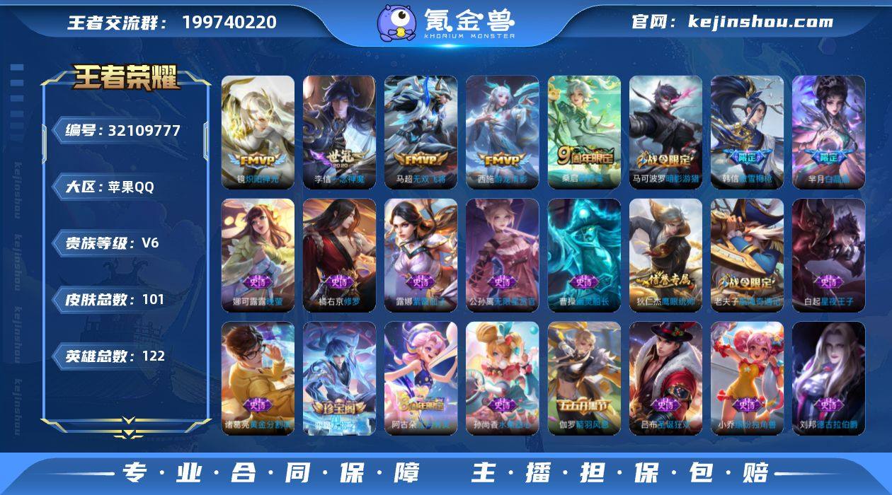 实名: 可修改 性别: 男号 贵族等级: V6 英雄数: 122 皮肤数: 101 传说皮: 炽阳神光,一念神魔,游龙清影,无双飞将 限定皮: 白晶晶,傲雪梅枪,鸣野蒿 亮点: 【优质装备】:炽阳神光,一念神魔,游龙清影(小青龙),无双飞将