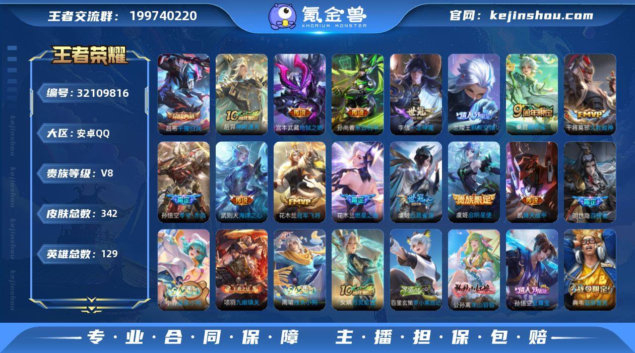 实名: 可修改 性别: 男号 贵族等级: V8 英雄数: 129 皮肤数: 342 荣耀水晶: 千魇归渊 传说皮: 冠军飞将,绛天战甲,久胜战神,一念神魔,云霓雀翎,末日机甲-孙尚香,零号·赤焰,海洋之心,地狱之眼,燃星之曲,神树通天 限定皮: 遇见飞天,李小龙,梁祝,烈魂,魔法小厨娘,白晶晶,天狼溯光者,奇迹圣诞,飞衡,天狼征服者,天狼运算者,瑞麟志,至尊宝,默契交锋-兰陵王,默契交锋-花木兰,霸王别姬-项羽,霸王别姬-虞姬,高山流水,五谷丰年,鸣野蒿 亮点: 【优质装备】:冠军飞将,绛天战甲(鸡嘴战神),久胜战神,一念神魔,云霓雀翎,末日机甲-孙尚香(绿蚂蚱),零号·赤焰,海洋之心,地狱之眼,燃星之曲,涂山容容