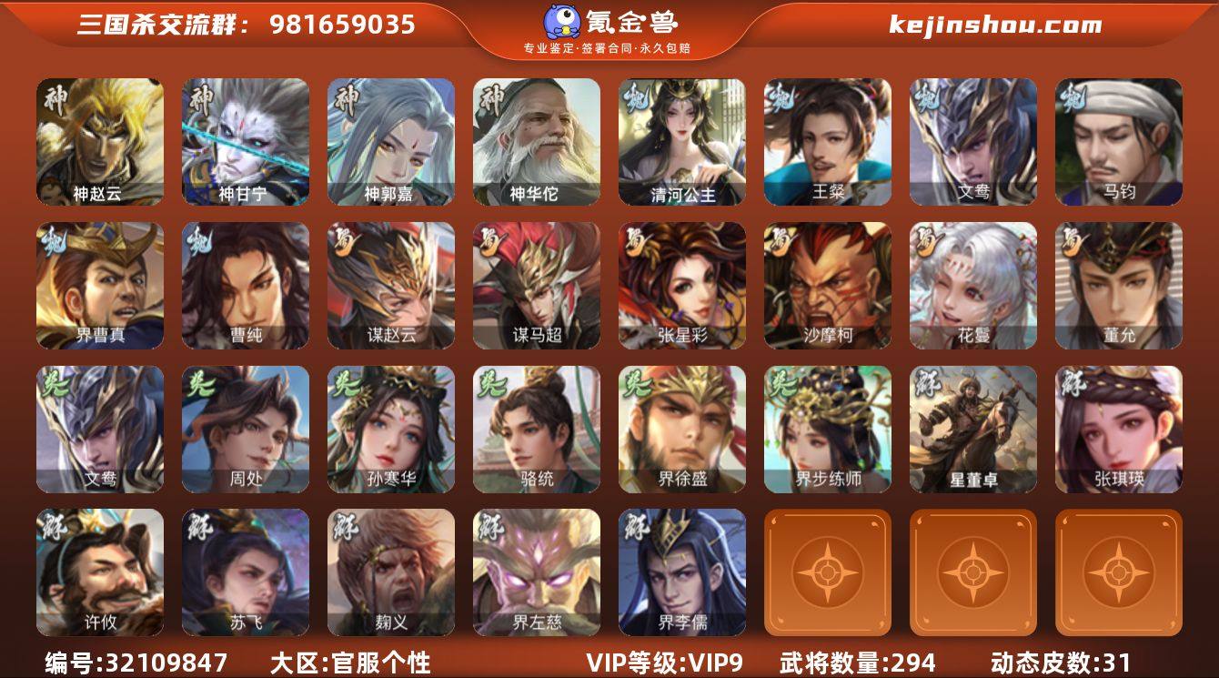 【1922】官阶:骠骑将军;VIP等级:VIP9;史诗武将数量:31;动态皮肤数量:31;武将总数:294;史诗宝珠数量:42;将魂数量:9406;神将:6;魏国史诗武将:18;蜀国史诗武将:6;吴国史诗武将:5;群史诗武将:8 神赵云,神甘宁,神郭嘉,神华佗,神吕蒙,神周瑜,王粲,文鸯,魏-司马昭,马钧,界曹真,曹纯,清河公主,谋赵云,谋马超,张星彩,沙摩柯,花鬘,董允,周处,孙寒华,骆统,界徐盛,界步练师,谋荀彧,张琪瑛,苏飞,麹义,界左慈,界李儒,许攸,星董卓,神郭嘉-虎年清明(动态),神郭嘉-倚星折月(动态),神甘宁-万人辟易(动态),神曹操-天下归心,曹丕-气荡山河(动态),甄姬-明珠耀躯(动态),SP蔡文姬-兔年冬日(动态),曹昂-竭战麟伤(动态),曹纯-虎年春节(动态),曹纯-长坂败备(动态),司马昭-昭威淮南(动态),星徐晃-斧引霹雳(动态),清河公主-魅影萦心(动态),张星彩-临军对阵(动态),卧龙诸葛-火烧博望(动态),孙策-兔年中秋(动态),周处-义除三害(动态),孙权-永开吴祚(动态),周瑜-兔年七夕(动态),孙寒华-莲华熠熠(动态),周瑜-免年清明(动态),徐盛-破军杀将(动态),孙寒华-蛇年限定(动态),文鸯-势若万钧(动态),许攸-火烧乌巢(动态),麹义-扬刀立威(动态),吕布-虓虎之勇(动态),左慈-役使鬼神(动态),界吕布-虓虎之勇(动态),李儒-鸠杀少帝(动态),界李儒-鸠杀少帝(动态),张琪瑛-虎年冬至(动态),左慈-蛇年限定(动态)