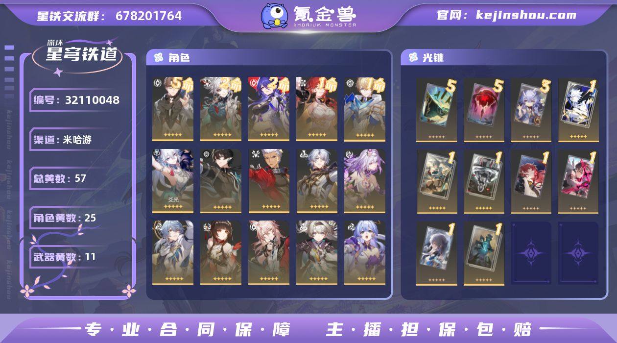 【崩坏·星穹铁道】冒险等级:70,女主,五星数量:36,五星角色:瓦尔特 * 5命,飞霄 * 2命,黄泉 * 2命,姬子 * 1命,杰帕德 * 1命,椒丘,白露,布洛妮娅,灵砂,彦卿,克拉拉,星期日,卡芙卡,遐蝶,镜流,托帕&账账,真理医生,花火,砂金,知更鸟,白厄,Archer,丹恒·腾荒,爻光,流萤__五星光锥:星海巡航 * 5精,记一位星神的陨落 * 5精,时节不居 * 3精,银河铁道之夜,以世界之名,以世界之名,但战斗还未结束,我将,巡征追猎,孤独的疗愈,行于流逝的岸,黎明恰如此燃烧__四星角色:阿兰 * 6命,貊泽 * 6命,黑塔 * 6命,丹恒 * 6命,艾丝妲 * 6命,希露瓦 * 6命,停云 * 6命,桑博 * 6命,三月七 * 6命,青雀 * 6命,佩拉 * 6命,驭空 * 6命,卢卡 * 6命,玲可 * 6命,雪衣 * 6命,米沙 * 6命,加拉赫 * 6命,虎克 * 5命,素裳 * 5命,桂乃芬 * 5命,娜塔莎 * 4命,寒鸦 * 1命2+1黄泉队 2+1飞霄追击队 0+1白厄队 记忆队
