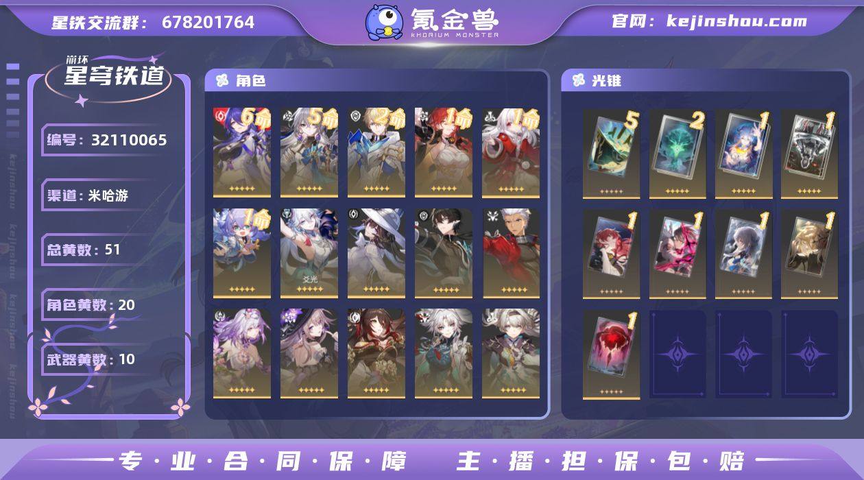 【崩坏·星穹铁道】冒险等级:70,男主,五星数量:30,五星角色:黄泉 * 6命,布洛妮娅 * 5命,杰帕德 * 2命,白露 * 1命,姬子 * 1命,克拉拉 * 1命,飞霄,彦卿,大黑塔,忘归人,遐蝶,真理医生,花火,砂金,知更鸟,Archer,丹恒·腾荒,大丽花,爻光,流萤__五星光锥:星海巡航 * 5精,不息的演算 * 2精,记一位星神的陨落,银河铁道之夜,以世界之名,如泥酣眠,但战斗还未结束,但战斗还未结束,行于流逝的岸,当她决定看见__四星角色:阿兰 * 6命,貊泽 * 6命,黑塔 * 6命,丹恒 * 6命,艾丝妲 * 6命,三月七 * 6命,佩拉 * 6命,卢卡 * 6命,寒鸦 * 6命,米沙 * 6命,加拉赫 * 6命,希露瓦 * 5命,素裳 * 5命,青雀 * 4命,驭空 * 4命,玲可 * 4命,虎克 * 3命,桂乃芬 * 3命,娜塔莎 * 2命,停云 * 2命,桑博 * 2命,雪衣 * 2命满命黄泉