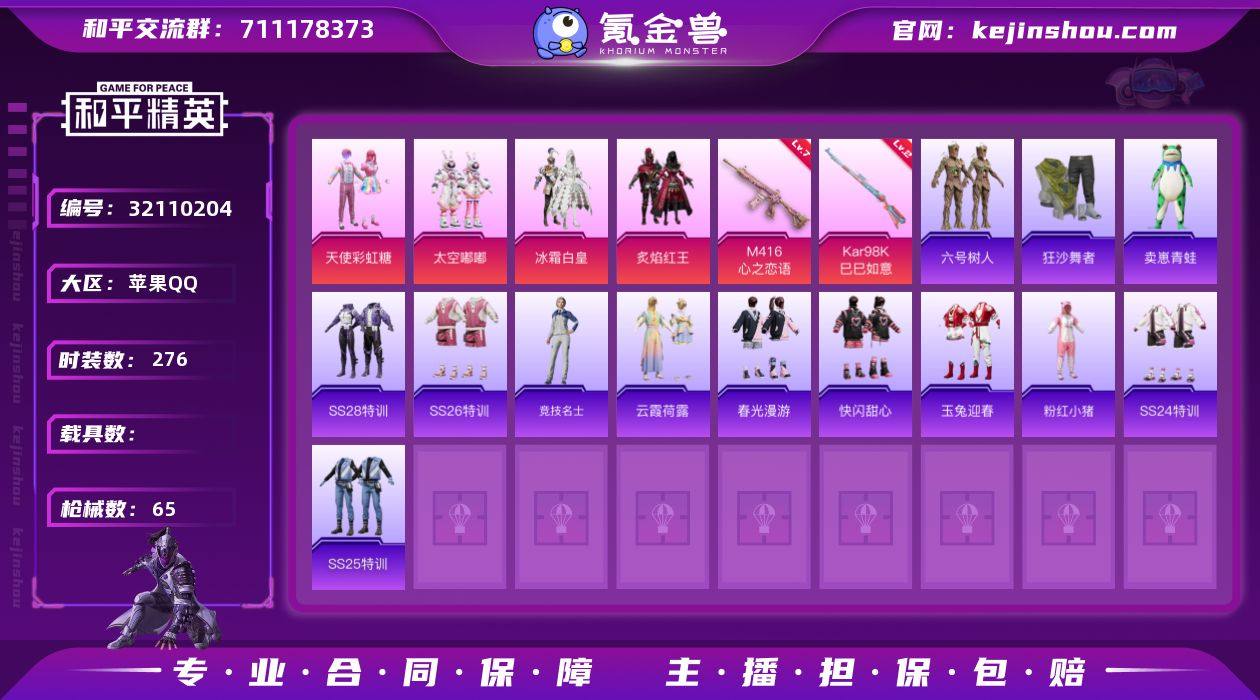 【特价出售】安卓封号十年苹果Q-4粉装3特效枪5热门67套装65枪皮 22923热力值 2印记 历史超级王牌6星 【4粉装】 天使彩虹糖 太空嘟嘟 冰霜白皇 炙焰红王 【3特效枪】 M416-心之恋语 (7级) Kar98K-巳巳如意 (2级) Mk14-福马献瑞 (4级) 【5热门】 六号树人 粉红小猪 狂沙舞者 破蛋小黄鸡 军刀雅典娜 【1飞行器】 太空嘟嘟飞行器 【3头盔】 童趣迷兔头盔 甜心宝贝头盔 幻影战神头盔 【2背包】 甜心宝贝背包 萌熊伴侣背包