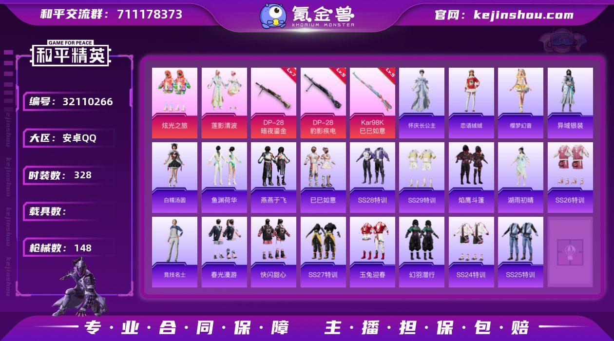 【特价出售】安卓Q-2粉装3特效枪2热门91套装148枪皮 39847热力值 16印记 历史传奇王牌13星 【2粉装】 炫光之旅 莲影清波 【3特效枪】 Kar98K-巳巳如意 (5级) DP-28-豹影疾电 (5级) DP-28-暗夜鎏金 (7级) 【2热门】 龟仙人 破蛋小黄鸡 【1背包】 梦幻火箭背包