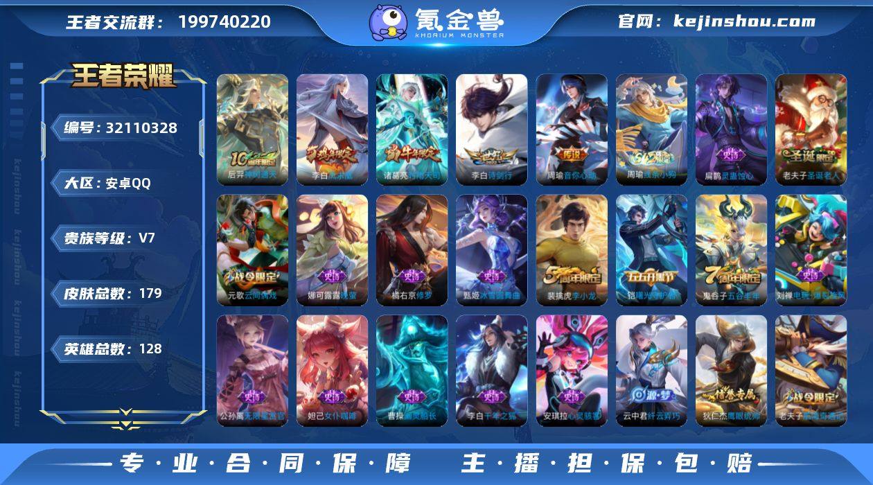 实名: 可修改 性别: 男号 贵族等级: V7 英雄数: 128 皮肤数: 179 传说皮: 音你心动-周瑜,神树通天 限定皮: 李小龙,游园惊梦,梁祝,时雨天司,凤求凰,高山流水,圣诞老人,五谷丰年,诗剑行 亮点: 【优质装备】:音你心动-周瑜