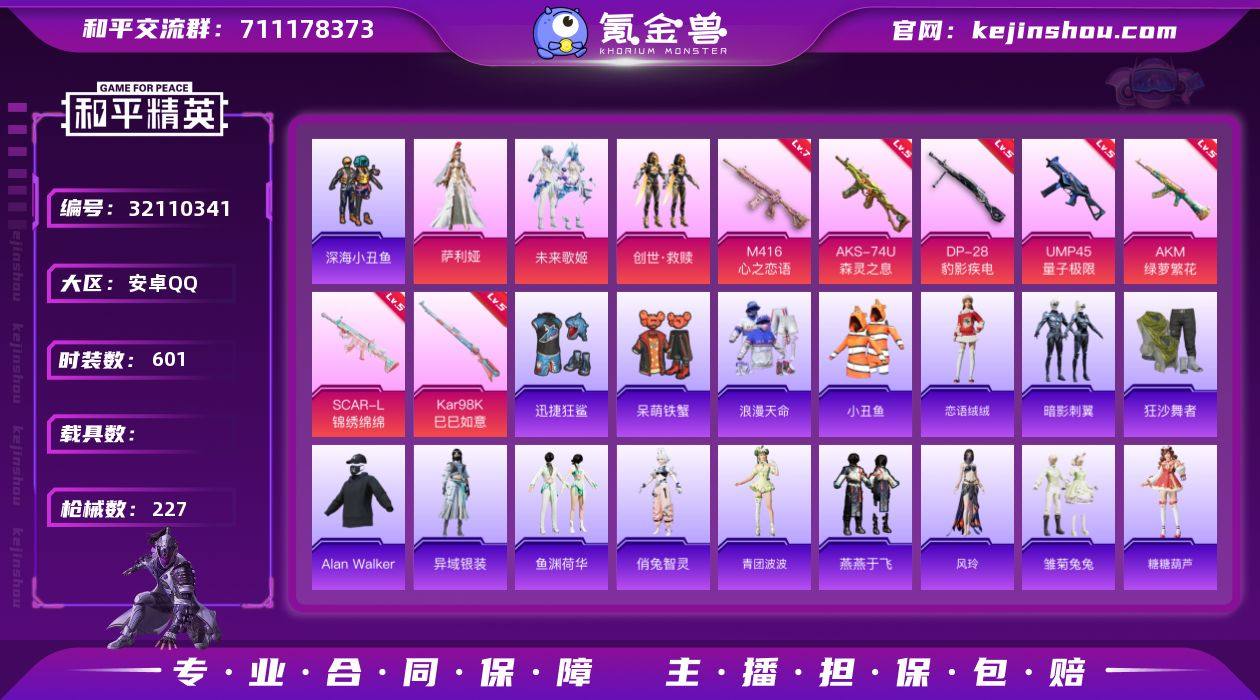 【特价出售】安卓Q-3稀有3粉装10特效枪10热门157套装227枪皮 66324热力值 15印记 历史超级王牌11星 【3稀有】 AKM-缤纷海域 AKM-百万伏特 浪漫天命 【3粉装】 萨利娅 未来歌姬 创世救赎 【10特效枪】 SCAR-L-锦绣绵绵 (5级) M416-心之恋语 (7级) AKS-74U-森灵之息 (5级) AKM-绿萝繁花 (5级) Kar98K-巳巳如意 (5级) DP-28-豹影疾电 (5级) UMP45-量子极限 (5级) AKS-74U-森灵之息 (5级) Mk14-福马献瑞 (3级) ACE32-萌骑漫游 (5级) 【10热门】 Mark.06 小丑鱼 龟仙人 呆萌铁蟹 迅捷狂鲨 深海小丑鱼 狂沙舞者 破蛋小黄鸡 弄潮海豚 M762-奇异狩猎者 【3飞行器】 拂晓神骑飞行器 闪光银龙飞行器 天之羽翼飞行器 【3头盔】 幻影战神头盔 深海小丑鱼头盔 金羽特工头盔