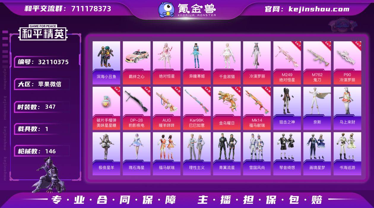 实名: 可修改 时装数: 347 载具数: 1 枪械数: 146 战备数: 1 热门装扮: 呆萌铁蟹,深海小丑鱼,迅捷狂鲨,千金淑猫,冷漠罗丽,异瞳寒姬,绝对恒星 载具: 羁绊之心 稀有枪皮: Kar98K-巳巳如意,M762-鬼刀,AUG-暖羊咩咩,P90-冷漠罗丽,破片手榴弹-美味星星糖,DP-28-豹影疾电,M249-绝对恒星,MK14-福马献瑞,信号枪-金乌曜日 亮点: 【优质装备】:七级M762-鬼刀,七级P90-冷漠罗丽,七级破片手榴弹-美味星星糖,七级M249-绝对恒星
