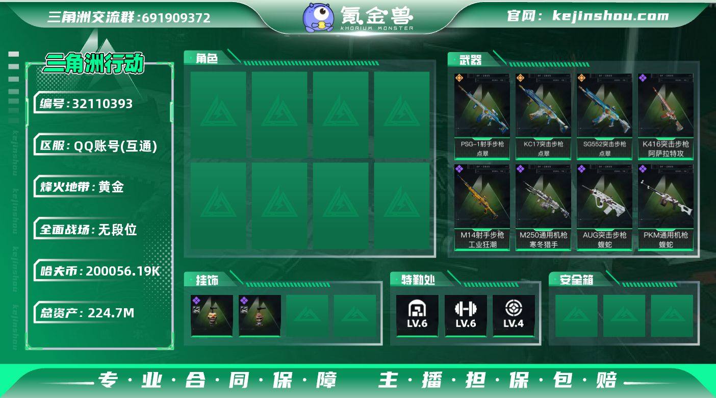 实名:不可二次实名 总资产:224.7M 哈夫币:200056.19K 烽火地带段位:黄金 烽火地带等级:60 全面战场段位:无段位 全面战场等级:1 6级仓库,6级训练中心,4级靶场,3级指挥中心,0级潜水中心,3级防具台,3级工作台,3级制药台,2级技术中心,0级收藏室 战术部门等级:2 战斗部门等级:1 医疗部门等级:2 研发部门等级:1 后勤部门等级:1 曼德尔砖-气象感应:0 曼德尔砖-命运王牌:0 曼德尔砖-电玩高手:0 曼德尔砖-美杜莎:0