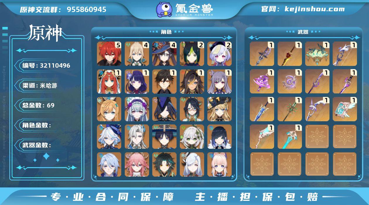 【原神】冒险等级:60,五星数量:47,五星角色:迪卢克 * 5命,莫娜 * 4命,琴 * 4命,七七 * 2命,提纳里 * 2命,迪希雅 * 1命,刻晴 * 1命,雷电将军 * 1命,钟离 * 1命,妮露 * 1命,珊瑚宫心海,神里绫华,优菈,达达利亚,梦见月瑞希,申鹤,八重神子,神里绫人,那维莱特,夜兰,芙宁娜,娜维娅,闲云,爱可菲,纳西妲,流浪者,枫原万叶,甘雨,魈,胡桃,克洛琳德,可莉__五星武器:鹤鸣余音,有乐御簾切,阿莫斯之弓,不灭月华,和璞鸢,松籁响起之时,天空之卷,天空之刃,天空之翼,雾切之回光,薙草之稻光,神乐之真意,若水,赦罪__四星角色:班尼特 * 6命,行秋 * 6命,九条裟罗 * 6命,香菱 * 6命,凝光 * 6命,迪奥娜 * 6命,砂糖 * 6命,坎蒂丝 * 6命,多莉 * 6命,柯莱 * 6命,卡维 * 6命,芭芭拉 * 6命,云堇 * 6命,早柚 * 6命,托马 * 6命,烟绯 * 6命,重云 * 6命,诺艾尔 * 6命,罗莎莉亚 * 6命,雷泽 * 6命,菲谢尔 * 6命,北斗 * 6命,久岐忍 * 5命,琳妮特 * 5命,珐露珊 * 4命,五郎 * 4命,鹿野院平藏 * 3命,瑶瑶 * 3命,米卡 * 3命,菲米尼 * 3命,嘉明 * 3命,莱依拉 * 2命,辛焱 * 2命,卡齐娜 * 1命,绮良良 * 1命,夏沃蕾 * 1命,埃洛伊,欧洛伦,伊安珊,爱诺,赛索斯