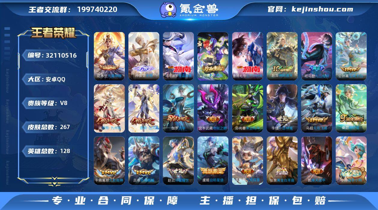实名: 可修改 性别: 女号 贵族等级: V8 英雄数: 128 皮肤数: 267 荣耀水晶: 九霄神辉 无双皮: 无相 珍品传说: 江户川柯南,怪盗基德,时之奇旅-孙策 传说皮: 绛天战甲,黄金白羊座,久胜战神,一念神魔,末日机甲-孙尚香,地狱之眼,飞鸢探春,淬星耀世,无双飞将,云诺千山,九山相柳,神树通天 限定皮: 李小龙,魔法小厨娘,蜜橘之夏,太华,至尊宝,高山流水,孙行者,猪悟能,五谷丰年,怒海麟威,鸣野蒿,逐霄战戟,愿照·山河定,愿照·九州拓 亮点: 【优质装备】:九霄神辉(木兰典藏),江户川柯南,怪盗基德,绛天战甲(鸡嘴战神),黄金白羊座,久胜战神,一念神魔,末日机甲-孙尚香(绿蚂蚱),地狱之眼,飞鸢探春,淬星耀世,无双飞将,涂山容容