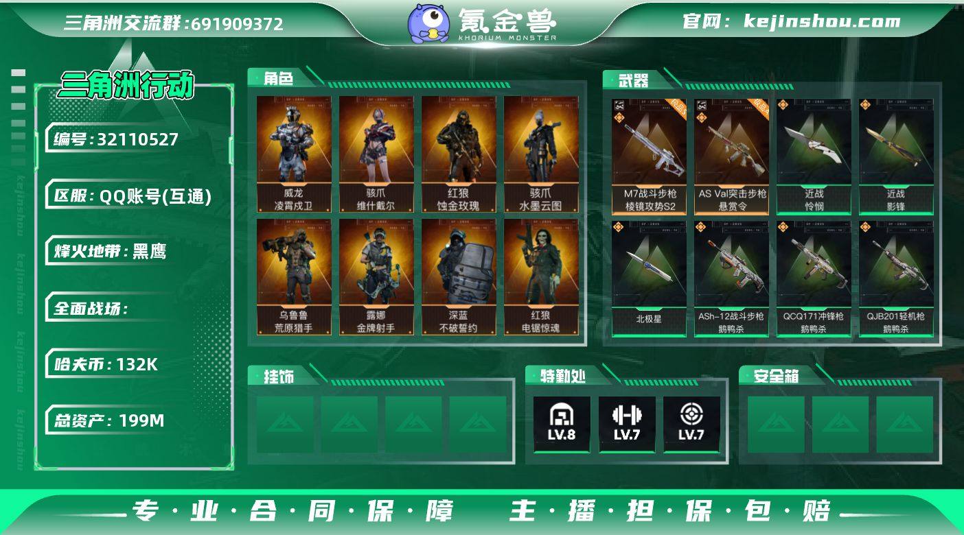"YXB-追缴14w-满体满负-132k哈伏币-总资产199m流动资产14m-60烽火等级-黑鹰-30战场等级-上等兵 s83x3 部门34343特勤处仓库8训练中心7靶场7 【干员外观】:红狼-蚀金玫瑰,骇爪-水墨云图,骇爪-维什戴尔,威龙-凌霄戍卫,蜂医-送葬人·无题密令,深蓝-不破誓约,红狼-电锯惊魂,露娜-金牌射手,乌鲁鲁-荒原猎手 【近战皮肤】:近战-北极星,近战-影锋,近战-怜悯,近战-黑鹰 【典藏外观】:M7战斗步枪-棱镜攻势S2极品S,AS Val突击步枪-悬赏令极品A,M250通用机枪-电玩高手S2优品B,MP7冲锋枪-电玩高手S2优品S 【传说外观】:M4A1突击步枪-蚀金玫瑰,M4A1突击步枪-阿米娅,ASh-12战斗步枪-鹅鸭杀,M16A4突击步枪-狩猎时刻,SG552突击步枪-运动员,SCAR-H战斗步枪-水墨云图,SCAR-H战斗步枪-启航,G3战斗步枪-狩猎时刻,G3战斗步枪-骑士,CAR-15突击步枪-阿米娅,腾龙突击步枪-捞点薯条,K437突击步枪-北极星,KC17突击步枪-电锯惊魂,Vector冲锋枪-狩猎时刻,勇士冲锋枪-能天使-午夜邮差,QCQ171冲锋枪-北极星,QCQ171冲锋枪-鹅鸭杀,725双管霰弹枪-送葬人-无题密令,M250通用机枪-骑士之心,QJB201轻机枪-鹅鸭杀,M14射手步枪-蛮荒,R93狙击步枪-维什戴尔,AWM狙击步枪-捞点薯条,93R-捞点薯条,复合弓-黑·天际线 【挂饰】:挂饰-阿萨拉盾兵,挂饰-阿萨拉机枪兵,挂饰-赤霄游龙,挂饰-黄金视野,挂饰-维什戴尔,挂饰-北极星,挂饰-蚀金玫瑰,挂饰-黑,挂饰-诡影狙击兵,挂饰-崩岩重炮,挂饰-暗行哨兵,挂饰-聚宝盆,挂饰-三联装手炮,挂饰-来点薯条,挂饰-狩猎时刻,挂饰-晶石幻想,挂饰-枪匠,挂饰-启程,挂饰-龙门币,挂饰-雪人,挂饰-猎杀本能,挂饰-阿米娅,挂饰-仪典匕首,挂饰-大白鹅,挂饰-关山难越,挂饰-卡皮巴拉,挂饰-紧急会议,挂饰-紧急撤离,挂饰-麻将 "