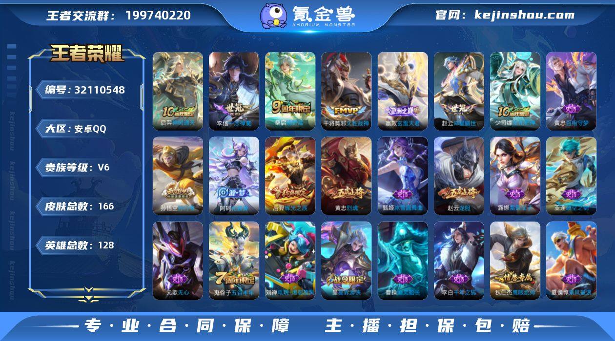 安卓Q-V6-永恒钻石IV段位-128英雄-166皮肤-6传说-42史诗 【英雄全皮】:空空儿全皮 【传说皮肤】:后羿神树通天,嬴政玄雷天君,桑启鸣野蒿,赵云淬星耀世,李信一念神魔,干将莫邪久胜战神 【限定皮肤】:蔡文姬夏日便利店,虞姬夏日便利店,姜子牙天穹之誓,狄仁杰阴阳师,赵云皇家上将,赵云龙胆,嬴政优雅恋人,孙尚香蔷薇恋人,钟无艳超时空战士,扁鹊奇幻香踪,元歌无心,甄姬落雪兰心,狄仁杰魔术师,狄仁杰万华元夜,达摩沙漠行僧,项羽海滩派对,程咬金演武夺筹,兰陵王金庭之子,孙悟空孙行者,后羿辉光之辰,李元芳云中旅人,钟馗驱傩正仪,杨戬潮玩骑兵,鬼谷子五谷丰年,黄忠烈魂,苏烈千军破阵,百里玄策原初追逐者,沈梦溪大漠名商,裴擒虎擒涛扼浪,嫦娥暖冬兔眠,鲁班大师探海日志,桑启海盐诗旅,暃星界游侠,张良古海寻踪,鬼谷子天穹祈灯,沈梦溪龙舞盛年,刘邦剑破天穹,周瑜熔金海岸 【年限皮肤】:后羿辉光之辰 【赛季限定】:狄仁杰万华元夜,程咬金演武夺筹,钟馗驱傩正仪,苏烈千军破阵,达摩沙漠行僧,兰陵王金庭之子,沈梦溪大漠名商,李元芳云中旅人,桑启海盐诗旅,裴擒虎擒涛扼浪,鲁班大师探海日志,张良古海寻踪,鬼谷子天穹祈灯,刘邦剑破天穹,姜子牙天穹之誓,东皇太一噬灭天穹,太乙真人谧流熔炉,钟馗虚灵犬护,甄姬逆浪荇歌,亚瑟荣光之誓,百里玄策原初追逐者 【战令限定】:钟无艳超时空战士,甄姬落雪兰心,暃星界游侠,嫦娥暖冬兔眠,扁鹊奇幻香踪,杨戬潮玩骑兵,蔡文姬夏日便利店,虞姬夏日便利店,亚连破空之剑,孙悟空神迹守卫 【史诗皮肤】:少司缘巫礼祀神,黄忠百相守梦,阿轲化蝶舞,亚连破空之剑,蔡文姬夏日便利店,刘禅电玩爆裂旋风,扁鹊奇幻香踪,暃星界游侠,元歌无心,鬼谷子五谷丰年,钟无艳超时空战士,孙悟空孙行者,百里玄策原初追逐者,黄忠烈魂...