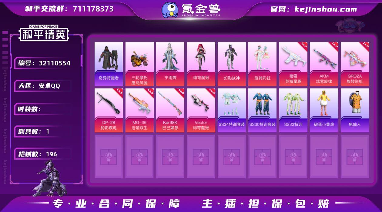 安卓Q 可二次 1载具4粉装10特效枪1飞行器124套装196枪皮 奇异狩猎者 鬼马风驰 宁雨蝶 绯穹魔姬 幻影战神 旋转彩虹 AKM-炫紫旋律(7级) AKS-74U-森灵之息(5级) Kar98K-巳巳如意(5级) Vector-绯穹魔姬(2级) MG-36-沧焰双生(5级) DP-28-豹影疾电(5级) 蜜獾-荧海星豚(7级) GROZA-旋转彩虹(7级) AKS-74U-森灵之息(5级) Mk14-福马献瑞(4级) 星际浪客飞行器 梦幻火箭头盔 甜心宝贝头盔 幻影战神头盔 幻影战神背包 龟仙人 破蛋小黄鸡 AKM-奇异狩猎者 M762-奇异狩猎者 AWM-激战未来 和平精英账号