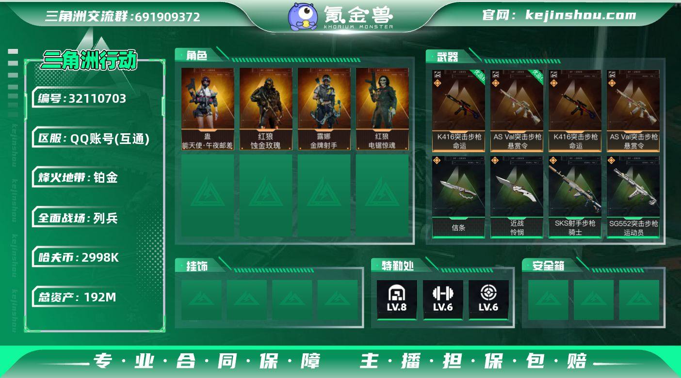 192m总资产-2998k哈伏币-60烽火等级-铂金-12战场等级-列兵- SM2021 【干员外观】:红狼-蚀金玫瑰,蛊-能天使午夜邮差,红狼-电锯惊魂,露娜-金牌射手 【近战皮肤】:近战-信条,近战-怜悯,近战-黑鹰 【典藏外观】:K416突击步枪-命运,AS Val突击步枪-悬赏令 【典藏外观成色】:K416突击步枪-命运(优品B),AS Val突击步枪-悬赏令(优品C) 【传说外观】:M4A1突击步枪-蚀金玫瑰,M4A1突击步枪-阿米娅,ASh-12战斗步枪-鹅鸭杀,SG552突击步枪-运动员,AK-12突击步枪-特斯拉线圈,SCAR-H战斗步枪-启航,G3战斗步枪-骑士,CAR-15突击步枪-阿米娅,腾龙突击步枪-捞点薯条,KC17突击步枪-电锯惊魂,P90冲锋枪-信条,Vector冲锋枪-能天使-午夜邮差,UZI冲锋枪-特斯拉线圈,SR-3M紧凑突击步枪-特斯拉线圈,勇士冲锋枪-能天使-午夜邮差,QCQ171冲锋枪-鹅鸭杀,M250通用机枪-骑士之心,QJB201轻机枪-鹅鸭杀,M14射手步枪-电锯惊魂,SKS射手步枪-骑士,SR-25射手步枪-信条,R93狙击步枪-维什戴尔,M700狙击步枪-零度协议,AWM狙击步枪-捞点薯条,93R-捞点薯条 【史诗外观】:ASh-12战斗步枪-无极限,K416突击步枪-冬日风情,M16A4突击步枪-竞赛选手,AUG突击步枪-蝮蛇,M7战斗步枪-百步穿杨,SG552突击步枪-深海恐惧,G3战斗步枪-流沙送葬,AS Val突击步枪-百步穿杨,腾龙突击步枪-猎鳄行动,K437突击步枪-守护者,MP5冲锋枪-战术竞备,MP5冲锋枪-竞技风,Vector冲锋枪-百步穿杨,Vector冲锋枪-异域战争,SR-3M紧凑突击步枪-战术竞备,勇士冲锋枪-工业狂潮,MP7冲锋枪-守护者,S12K霰弹枪-曙光,PKM通用机枪-蝮蛇,M250通用机枪-囚徒,Mini-14射手步枪-守护者,M14射手步枪-甜心子弹,SV-98狙击步枪-林中猎手,M700狙击步枪-蝮蛇,M700狙击步枪-百步穿杨,M700狙击步枪-哈夫克警备,AWM狙击步枪-无极限,AWM狙击步枪-流沙送葬...