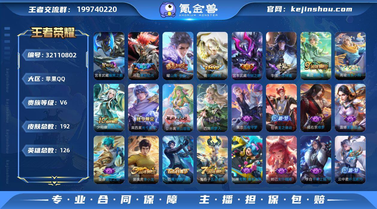 贵族6/皮肤192/传说6/史诗44/英雄126/孙权全皮/鬼谷子全皮/幽冥之眼/鸣野蒿/琥珀纪元马超/山海·苍雷引/炽阳神光/一念神魔/地狱之眼/天穹之誓(s36)/阴阳师/皇家上将/蔷薇恋人/高山流水/玩趣恶龙/奇幻香踪/魔术师/万华元夜(s22)/海滩派对/醍醐杖(s20)/演武夺筹(s23)/金庭之子(s27)/云中旅人(s29)/驱傩正仪(s24)/遇见飞天/潮玩骑兵/繁星吟游/原初探秘者(s21)/五谷丰年/千军破阵(s25)/混沌棋(s18)/大漠名商(s28)/疑决卦(s19)/李小龙/擒涛扼浪(s31)/纤云弄巧/探海日志(s32)/海盐诗旅(s30)/江河有灵/古海寻踪(s33)/蒙恬荣光圣徽/鬼谷子天穹祈灯(S34)/龙武盛年/剑破天穹(s35)/逆浪荇歌/破空之剑/神迹守卫/光弋星穹/往忆晖光/线条小狗-周瑜/钟馗锁墨魂/巫礼祀神/涂山容容/织梦人/百相守梦-黄忠/龙之律动/真我赫兹(百里守约)/电玩·爆裂旋风/修罗/鹰眼统帅/猫狗日记-孙策/节奏热浪/曙光守护者/特工魅影/冰冠公主/暗隐猎兽者/缤纷独角兽/乘风破浪/德古拉伯爵/乱世虎臣/千年之狐/绅士熊喵/圣诞狂欢/金属风暴/女仆咖啡/魅力维加斯/暗夜贵公子/水果甜心/鬼剑武藏/紫霞仙子/班班快跑/糖果风暴/谜偶窥秘/极光幻客/逐霄之志/鹤鸣心笺/径山谋武/罗小黑战记/克喵/踏浪烽翎/云械蓝图/星梦巡礼/雪境奇遇-西施/敬我三分/暗都幽影/功夫炙烤/时空谍影/完美运算/破局者/妄想特派/劲辣红锅/乐园追猎者/牛运亨通/潮玩探月行/幻泉雾影-海月/蔚蓝守将/唤灵魔甲/无双福将/乓乓大师/缤纷绘卷/秘密基地/无尽征程/圆桌骑士(盾山)/次元突破/炽热元素使/鲨炮海盗猫/归虚梦演-蒙犽/野性能量/丁香结/虹云星官/坚韧之力/幻乐之宴/敏锐之力/掌控之力/沉稳之力/制霸全明星/功夫老勺/命运角斗场/幻想奇妙夜/海滩丽影/龙腾万里/汉昭烈帝/纽约教父/万象初新/万事如意/花好人间/五福同心/兔女郎/死亡骑士/黄金武士/天使之翼/玩偶对对碰/未来纪元-宫本武藏/化...