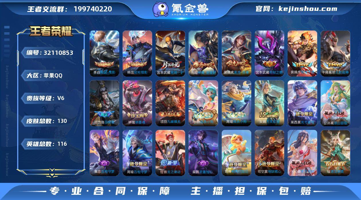 无二次-苹果Q-V6-至尊星耀I段位-116英雄-130皮肤-2典藏皮肤-1珍品传说-5传说-37史诗 【英雄全皮】:孙权全皮,影全皮 【荣耀典藏】:李白鸣剑曳影,韩信弑枪猎影 【珍品传说】:宫本武藏黑崎一护 【传说皮肤】:马超神骥逐星野,裴擒虎祥瑞亨通,裴擒虎寅虎赤拳,干将莫邪久胜战神,宫本武藏地狱之眼 【限定皮肤】:狄仁杰阴阳师,赵云皇家上将,元歌无心,狄仁杰魔术师,项羽海滩派对,苏烈千军破阵,百里玄策原初追逐者,裴擒虎寅虎赤拳,鲁班大师探海日志,司空震地狱燃心,张良古海寻踪,蒙犽百解令,沈梦溪龙舞盛年 【年限皮肤】:裴擒虎寅虎赤拳 【赛季限定】:苏烈千军破阵,鲁班大师探海日志,张良古海寻踪,东皇太一噬灭天穹,太乙真人谧流熔炉,钟馗虚灵犬护,甄姬逆浪荇歌,亚瑟荣光之誓,百里玄策原初追逐者,项羽九幽镇关 【战令限定】:司空震地狱燃心,孙悟空神迹守卫,刘禅鸭鸭历险记,沈梦溪鸭鸭历险记,周瑜百相守梦,孙策百相守梦,莱西奥光弋星穹,明世隐往忆晖光,周瑜线条小狗,小乔线条小狗 【史诗皮肤】:钟馗锁墨魂,明世隐百晓客,周瑜线条小狗,小乔线条小狗,项羽九幽镇关,女娲万灵启世,莱西奥光弋星穹,公孙离涂山容容,黄忠百相守梦,周瑜百相守梦,扁鹊灵蛊蚀心,狂铁龙之律动,刘禅鸭鸭历险记,大司命东方月初,蒙犽百解令,司空震地狱燃心,元歌无心,杨戬天秀启明,百里玄策原初追逐者,瑶遇见神鹿,橘右京修罗,公孙离无限星赏官,铠曙光守护者,百里守约特工魅影,雅典娜冰冠公主,诸葛亮黄金分割率,小乔缤纷独角兽,花木兰水晶猎龙者,李白千年之狐,曹操幽灵船长,吕布圣诞狂欢,墨子金属风暴,孙尚香水果甜心,狄仁杰魔术师,甄姬冰雪圆舞曲,赵云未来纪元,赵云皇家上将,露娜紫霞仙子 【其他皮肤】:吕布舞狮寰,鲁班七号班班快跑,虞姬溯影追猎,蚩奼极光幻客,艾琳...