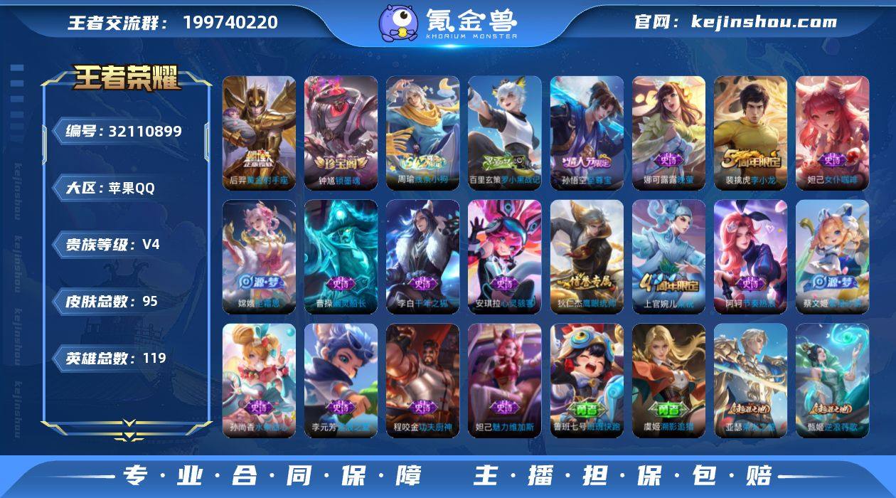 苹果Q 可二次 1传说119英雄95皮肤 黄金射手座 至尊宝 拒霜思 梁祝 原初探秘者 李小龙 逐浪之夏 晚萤 千年之狐 功夫厨神 心灵骇客 幽灵船长 节奏热浪 街头霸王 花好人间 饕餮 烛龙 重明 御霄 御銮 朔风刀 混沌棋 疑决卦 醍醐杖 万华元夜 演武夺筹 驱傩正仪 拳王 女仆咖啡 霸王丸 丁香结 科学大爆炸 魅力维加斯 水果甜心 繁星吟游 鹰眼统帅 王者荣耀账号