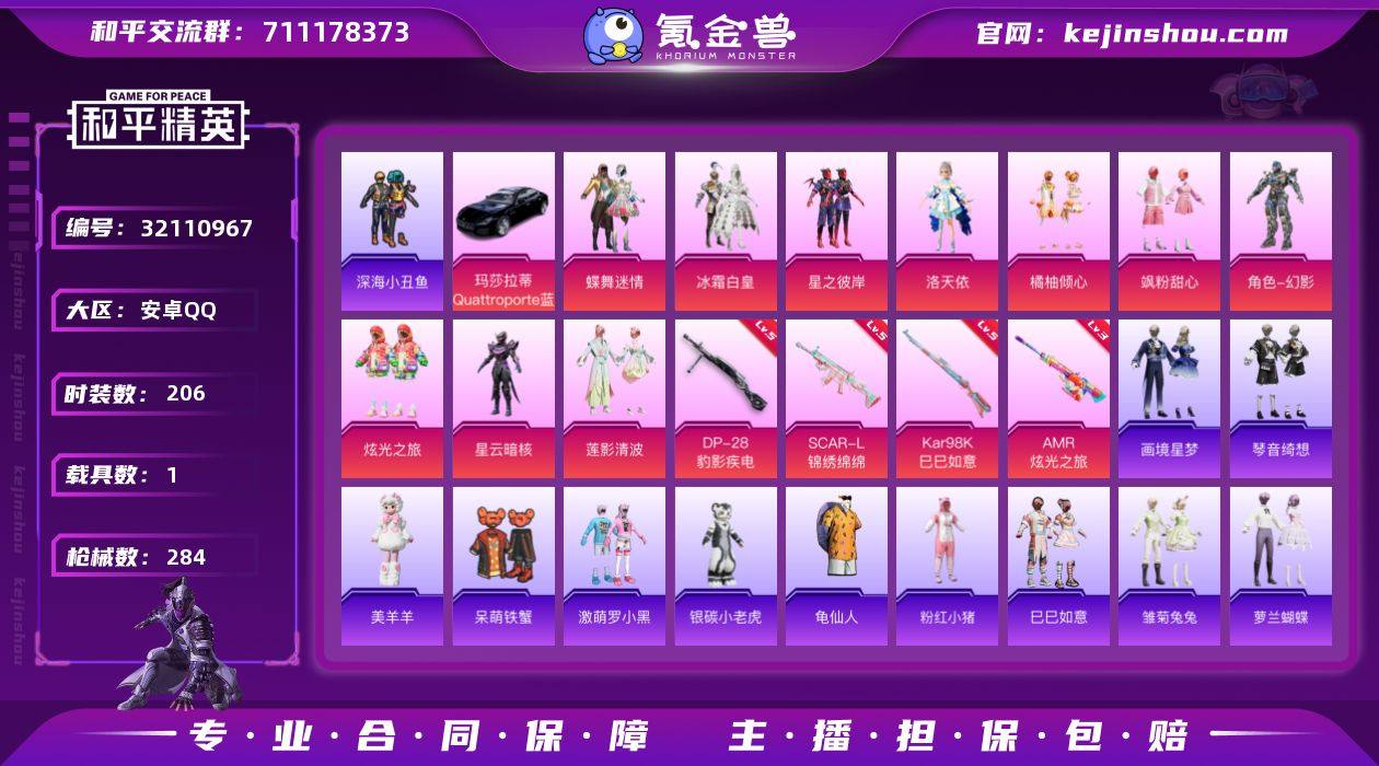 安卓 手Q-10粉装-4特效枪-1载具-3粉色飞行器-94966热力值-8王牌印记-206套装-284枪皮 【热门品类】:套装-深海小丑鱼,套装-龟仙人,套装-粉红小猪,撬棍-龙胆亮银枪 【粉色套装】:粉装-蝶舞迷情,粉装-冰霜白皇,粉装-星之彼岸,角色-洛天依,粉装-橘柚倾心,粉装-飒粉甜心,角色-幻影,粉装-炫光之旅,角色-星云暗核,粉装-莲影清波 【粉色枪皮等级】:SCAR-L-锦绣绵绵(五级),Kar98K-巳巳如意(五级),AMR-炫光之旅(三级),DP-28-豹影疾电(五级) 【粉色载具】:玛莎拉蒂Quattroporte(夜幕蓝) 【粉色枪皮】:SCAR-L-锦绣绵绵,Kar98K-巳巳如意,AMR-炫光之旅,DP-28-豹影疾电 【粉色飞行器】:炫彩糖果飞行器,梦幻火箭飞行器,纯梦嫁纱飞行翼 【粉色降落伞】:春暖花开降落伞,梦幻火箭降落伞,阿狸红降落伞,银刃赛罗降落伞,蓝莓炮弹降落伞,垂柳戏鸭降落伞,千面幻镜降落伞,旋转彩虹降落伞,海螺星光降落伞,飒粉甜心降落伞,天星战神降落伞,未来歌姬降落伞,粉樱探戈降落伞,炫光之旅降落伞,莲影清波降落伞,鬼刀降落伞,极意拳锋降落伞,炫彩糖果降落伞 【稀有套装】:套装-龟仙人,套装-巳巳如意,套装-炫彩糖果,套装-雏菊兔兔,套装-萝兰蝴蝶,套装-小熊娃娃,套装-糖糖葫芦,套装-青团波波,套装-棉花软糖,套装-燕燕于飞,套装-鱼渊荷华,玩偶服-美羊羊,套装-画境星梦,套装-琴音绮想 【稀有枪皮】:AKM-夜灯,AKM-彩虹符号,AKM-春暖花开,AKM-灼热熔岩,AKM-破晓战魂,AKM-胡桃卫兵,AKM-虎虎生威,AKM-霓虹街区,AKM-龙的传人,M16A4-幻世战舞者,M16A4-甜心亚梦,SCAR-L-炫彩节奏,SCAR-L-玉兔迎春,SCAR-L-甜蜜誓约,SCAR-L-红色方程式,SCAR-L-银碳小老虎,SCAR-L-龙宫之主,SCAR-L-净心行者,M416-糯团青竹,M416-红色方程式,M416-蓝色火焰,GROZA-异彩先驱,GROZA-懵萌河马,GROZA-春...
