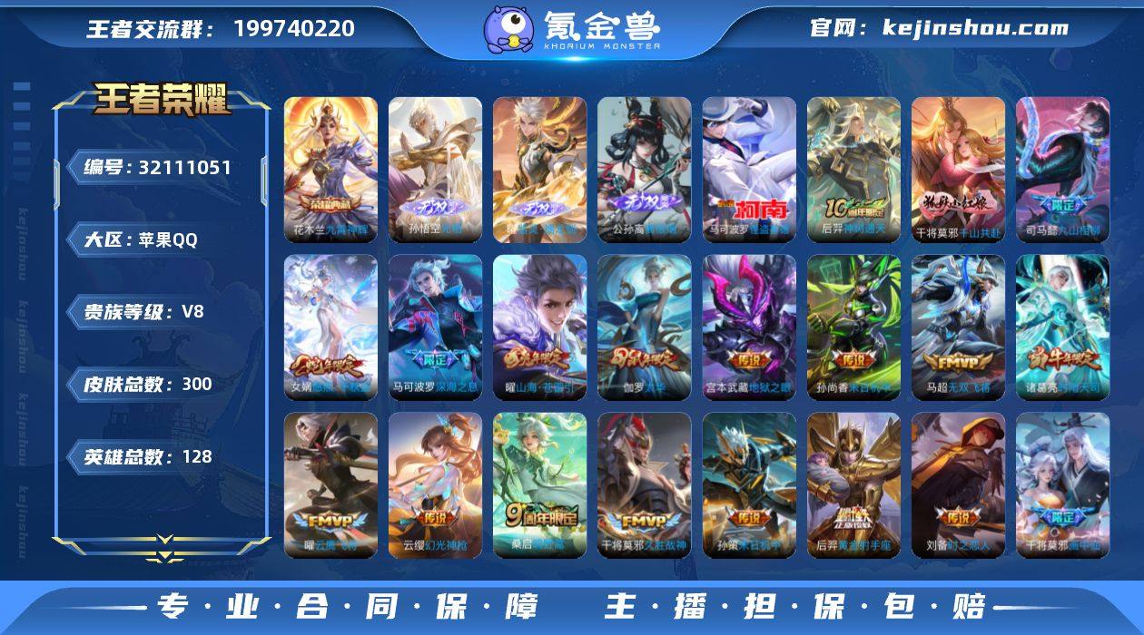 苹果Q-V8-最强王者段位-128英雄-300皮肤-1典藏皮肤-3无双-1珍品传说-23传说-91史诗【英雄全皮】:刘禅全皮,司马懿全皮,孙权全皮,上官婉儿全皮,敖隐全皮,戈娅全皮【荣耀典藏】:花木兰九霄神辉【无双皮肤】:孙悟空无相,曜器灵螭龙剑,公孙离离恨烟【珍品传说】:马可波罗怪盗基德【传说皮肤】:后羿神树通天,干将莫邪千山共赴,司马懿九山相柳,女娲愿照千秋盛,云缨幻光神枪,桑启鸣野蒿,上官婉儿妄想奇谈,干将莫邪画中仙,伽罗炽翼辉光,曜山海苍雷引,马可波罗深海之息,马超无双飞将,孙策挚爱之约,孙策末日机甲,诸葛亮时雨天司,虞姬启明星使,曜云鹰飞将,刘备时之恋人,伽罗太华,干将莫邪久胜战神,后羿黄金射手座,孙尚香末日机甲,宫本武藏地狱之眼【限定皮肤】:公孙离离恨烟,蒙犽顽岩魄,蔡文姬夏日便利店,大乔绒语心约,虞姬夏日便利店,姜子牙天穹之誓,杨戬破阵退雄兵,狄仁杰阴阳师,赵云皇家上将,鲁班七号狮舞东方,庄周高山流水,高渐离死亡摇滚,高渐离玩趣恶龙,扁鹊奇幻香踪,芈月幻夜卜梦,元歌无心,甄姬游园惊梦,马可波罗深海之息,狄仁杰魔术师,达摩沙漠行僧,项羽海滩派对,王昭君午后时光,兰陵王金庭之子,后羿圣弓游侠,李元芳银河之约,李元芳云中旅人,虞姬启明星使,钟馗驱傩正仪,杨戬潮玩骑兵,干将莫邪冰霜恋舞曲,干将莫邪真爱魔法,干将莫邪画中仙,雅典娜黎明之约,鬼谷子五谷丰年,诸葛亮时雨天司,黄忠火炮绅士,苏烈千军破阵,百里玄策原初追逐者,梦奇顽趣,沈梦溪大漠名商,裴擒虎擒涛扼浪,狂铁电玩高手,米莱狄胡桃异想国,云中君纤云弄巧,云中君时之祈愿,伽罗太华,伽罗炽翼辉光,孙策挚爱之约,上官婉儿梁祝,上官婉儿天狼绘梦者,上官婉儿神器万象笔,上官婉儿妄想奇谈,嫦娥拒霜思,嫦娥暖冬兔眠,曜山海苍雷引,西施玲珑珍味,鲁班大师探海...