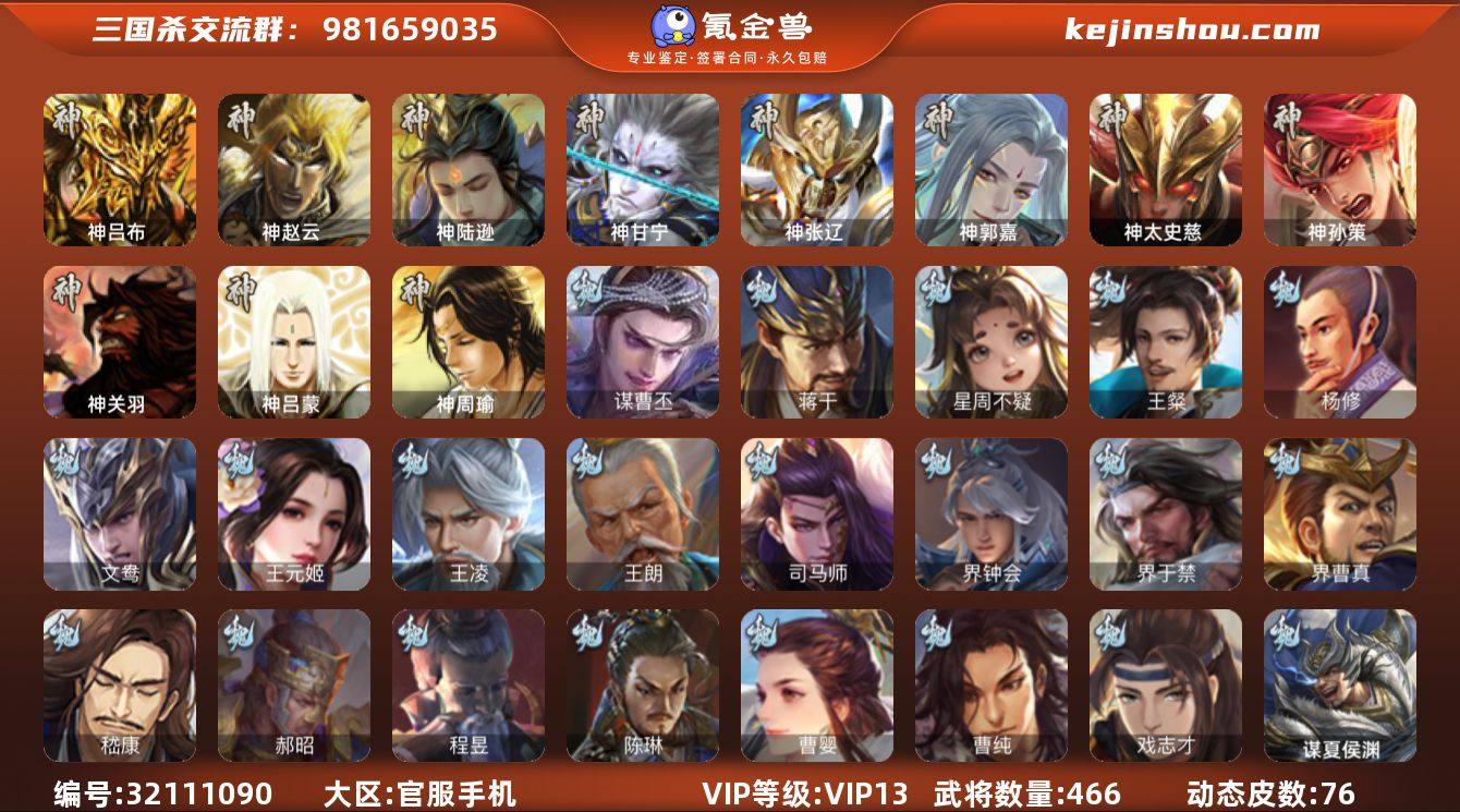 官阶:大将军;VIP等级:VIP13;史诗武将数量:79;动态皮肤数量:76;武将总数:466;史诗宝珠数量:0;将魂数量:3230;神将:8;魏国史诗武将:39;蜀国史诗武将:15;吴国史诗武将:11;群史诗武将:28