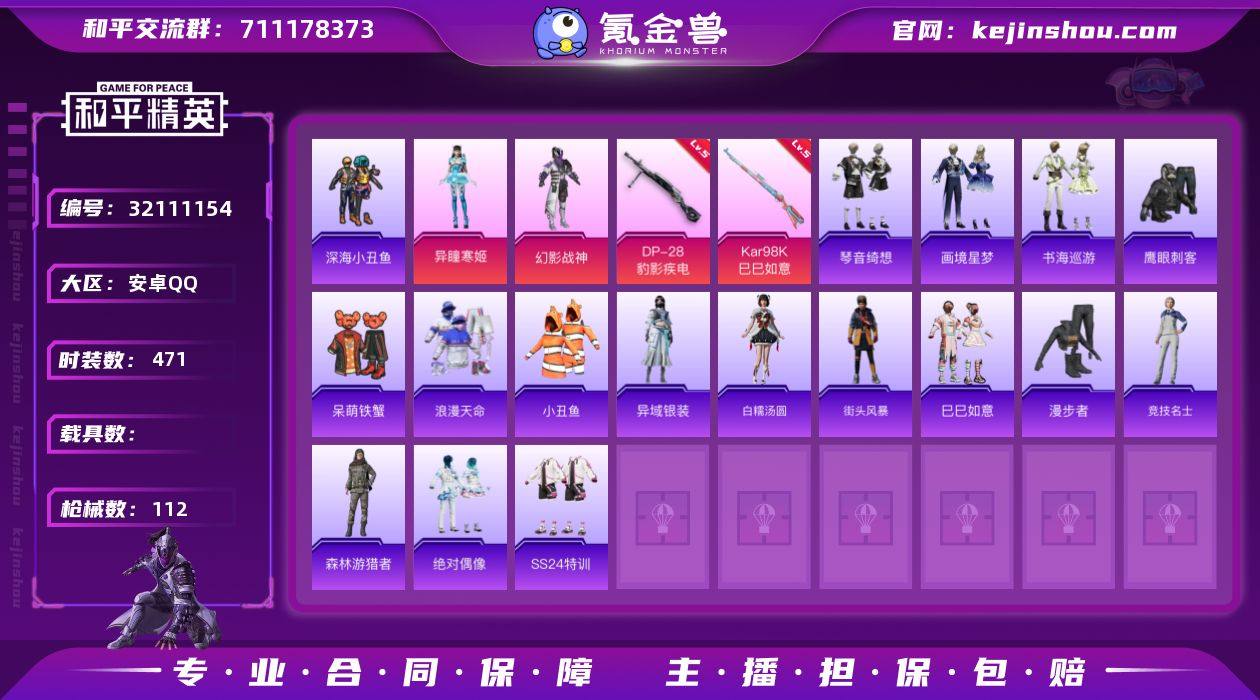 【特价出售】安卓Q-2稀有2粉装5特效枪8热门109套装112枪皮 30953热力值 5印记 历史超级王牌4星 【2稀有】 AKM-缤纷海域 浪漫天命 【2粉装】 异瞳寒姬 幻影战神 【5特效枪】 Kar98K-巳巳如意 (5级) DP-28-豹影疾电 (5级) 信号枪-金乌曜日 (2级) Mk14-福马献瑞 (5级) UMP45-萌骑冒险 (2级) 【8热门】 小丑鱼 龟仙人 呆萌铁蟹 鹰眼刺客 深海小丑鱼 漫步者 破蛋小黄鸡 极速红龙 【2背包】 幻影战神背包 深海小丑鱼背包