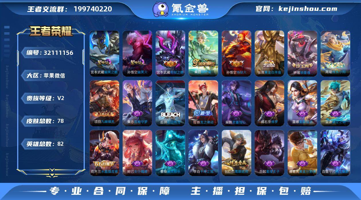 贵族等级:V2 典藏皮肤数:0 珍品无双皮肤数:0 无双皮肤数:0 珍品传说皮肤数:0 传说皮肤数:4 史诗皮肤数:28 皮肤数:78 英雄数:82 段位:绝世王者 卖家说:斐的市50强标还有其他很多标4个传说皮肤两个星传说还有很多史诗皮肤最高荣耀段位