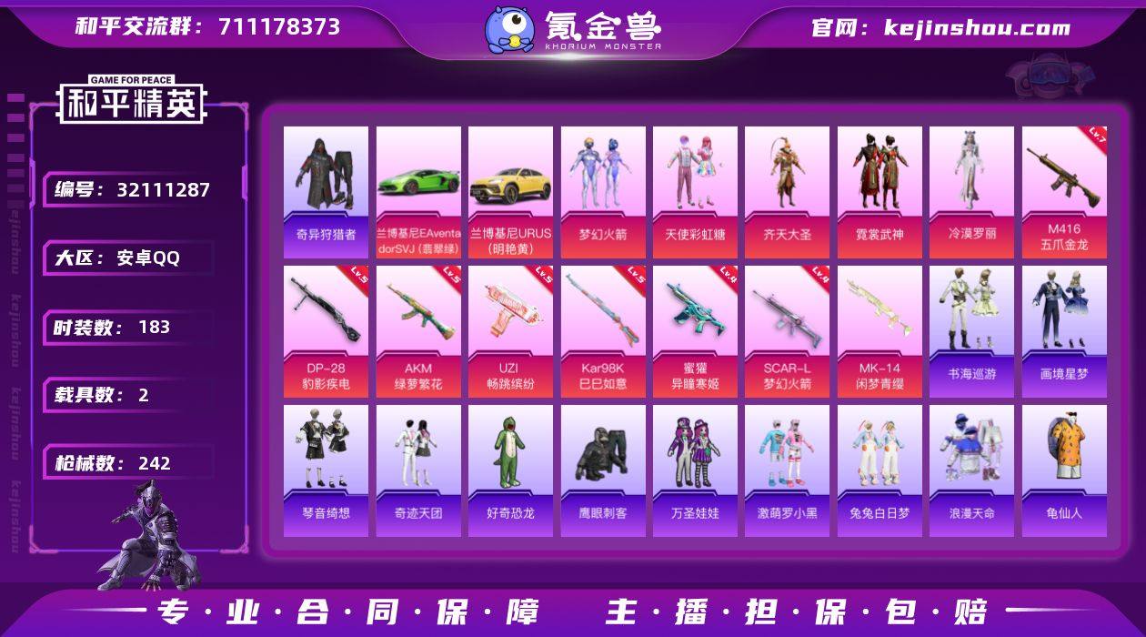 安卓 手Q-5粉装-10特效枪-2载具-1粉色飞行器-73017热力值-11王牌印记-183套装-242枪皮 【热门品类】:粉装-梦幻火箭,套装-浪漫天命,套装-奇异狩猎者,套装-龟仙人,套装-暗影哥特,套装-红红火火,角色-Mark.06,熔岩游骑兵连帽夹克 【粉色套装】:粉装-天使彩虹糖,粉装-梦幻火箭,粉装-齐天大圣,粉装-霓裳武神,角色-冷漠罗丽 【粉色枪皮等级】:AKM-绿萝繁花(五级),SCAR-L-梦幻火箭(四级),M416-五爪金龙(七级),蜜獾-异瞳寒姬(四级),UZI-畅跳缤纷(五级),AKS-74U-森灵之息(五级),Kar98K-巳巳如意(五级),Mk14-福马献瑞(一级),DP-28-豹影疾电(五级) 【粉色载具】:兰博基尼Aventador SVJ(翡翠绿),兰博基尼URUS(明艳黄) 【粉色枪皮】:AKM-绿萝繁花,SCAR-L-梦幻火箭,M416-五爪金龙,蜜獾-异瞳寒姬,UZI-畅跳缤纷,AKS-74U-森灵之息,Kar98K-巳巳如意,Mk14-闲梦青缨,Mk14-福马献瑞,DP-28-豹影疾电 【粉色飞行器】:炫彩糖果飞行器 【粉色降落伞】:梦幻火箭降落伞,王牌四分卫降落伞,齐天大圣降落伞,洛神天依降落伞,天星战神降落伞,幻彩电音降落伞,极意拳锋降落伞,炫彩糖果降落伞,暮色玫影降落伞 【稀有套装】:套装-龟仙人,套装-巳巳如意,套装-雪国风尚,套装-炫彩糖果,角色-临安公主,套装-风舞幻音,套装-书海巡游,套装-画境星梦,套装-琴音绮想 【稀有枪皮】:AUG-冰晶雪宝,AKM-夜灯,AKM-星兔领航员,AKM-玉龙,AKM-生命誓言,AKM-破晓战魂,AKM-萌趣颜团子,AKM-虎虎生威,AKM-霓虹街区,AKM-龙的传人,M16A4-凝视深渊,M16A4-幻世战舞者,M16A4-甜心亚梦,M16A4-魔法学院,SCAR-L-夜灯,SCAR-L-炫彩节奏,SCAR-L-玉兔迎春,SCAR-L-红色方程式,M416-糯团青竹,M416-红色方程式,M416-蓝色火焰,GROZA-彩虹符号,GROZA-影袭,GROZA-懵萌河马,GROZA-田园牧歌,GROZA-暮色玫影...