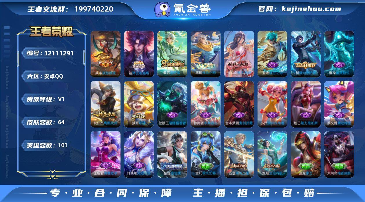 【精品小号·铠冥王哈迪斯·典韦战鼓燎原·可二次】YXw17770-安卓q-101英雄-64皮肤-6王者印记-135铭文-0w贵族积分【贵族1】【3传说·2按键·】【因赛季更新游戏段付以上号为准!】 【传说皮肤】:桑启鸣野蒿,铠冥王哈迪斯,典韦战鼓燎原 【限定皮肤】:铠冥王哈迪斯,蒙犽顽岩魄,姜子牙天穹之誓,狄仁杰阴阳师,项羽海滩派对,梦奇顽趣,沈梦溪大漠名商,桑启海盐诗旅,刘邦剑破天穹,周瑜熔金海岸 【赛季限定】:沈梦溪大漠名商,桑启海盐诗旅,刘邦剑破天穹,姜子牙天穹之誓,东皇太一噬灭天穹,太乙真人谧流熔炉,甄姬逆浪荇歌,亚瑟荣光之誓,梦奇顽趣 【战令限定】:亚连破空之剑,孙悟空神迹守卫,周瑜线条小狗 【史诗皮肤】:周瑜线条小狗,亚连破空之剑,大司命东方月初,蒙犽顽岩魄,梦奇顽趣,狄仁杰鹰眼统帅,蔡文姬舞动绿茵,铠曙光守护者,雅典娜冰冠公主,兰陵王暗隐猎兽者,小乔缤纷独角兽,曹操幽灵船长,妲己魅力维加斯,孙尚香水果甜心,宫本武藏鬼剑武藏,王昭君偶像歌手 【其他皮肤】:蚩奼极光幻客,亚瑟荣光之誓,甄姬逆浪荇歌,典韦铁骨偃魂,太乙真人谧流熔炉,东皇太一噬灭天穹,孙悟空神迹守卫,周瑜熔金海岸,姜子牙天穹之誓,大司命暗都幽影,刘邦剑破天穹,海诺时空谍影,莱西奥西部游侠,桑启海盐诗旅,沈梦溪大漠名商,鲁班大师乓乓大师,吕布野性能量,诸葛亮掌控之力,狂铁命运角斗场,狄仁杰阴阳师,宫本武藏万象初新,达摩拳王,亚瑟死亡骑士,典韦黄金武士,宫本武藏未来纪元,芈月红桃皇后,达摩大发明家,阿轲爱心护理,露娜哥特玫瑰,项羽海滩派对,阿古朵熊喵少女,曜归虚梦演,盘古创世神祝,伽罗花见巫女,孙策海之征途,元歌午夜歌剧院,裴擒虎街头旋风,杨玉环霓裳曲,梦奇美梦成真,铠龙域领主,夏侯惇战争骑士,蔡文姬蔷薇王座,孙悟空西部大镖客,露娜绯红之刃,鲁班...